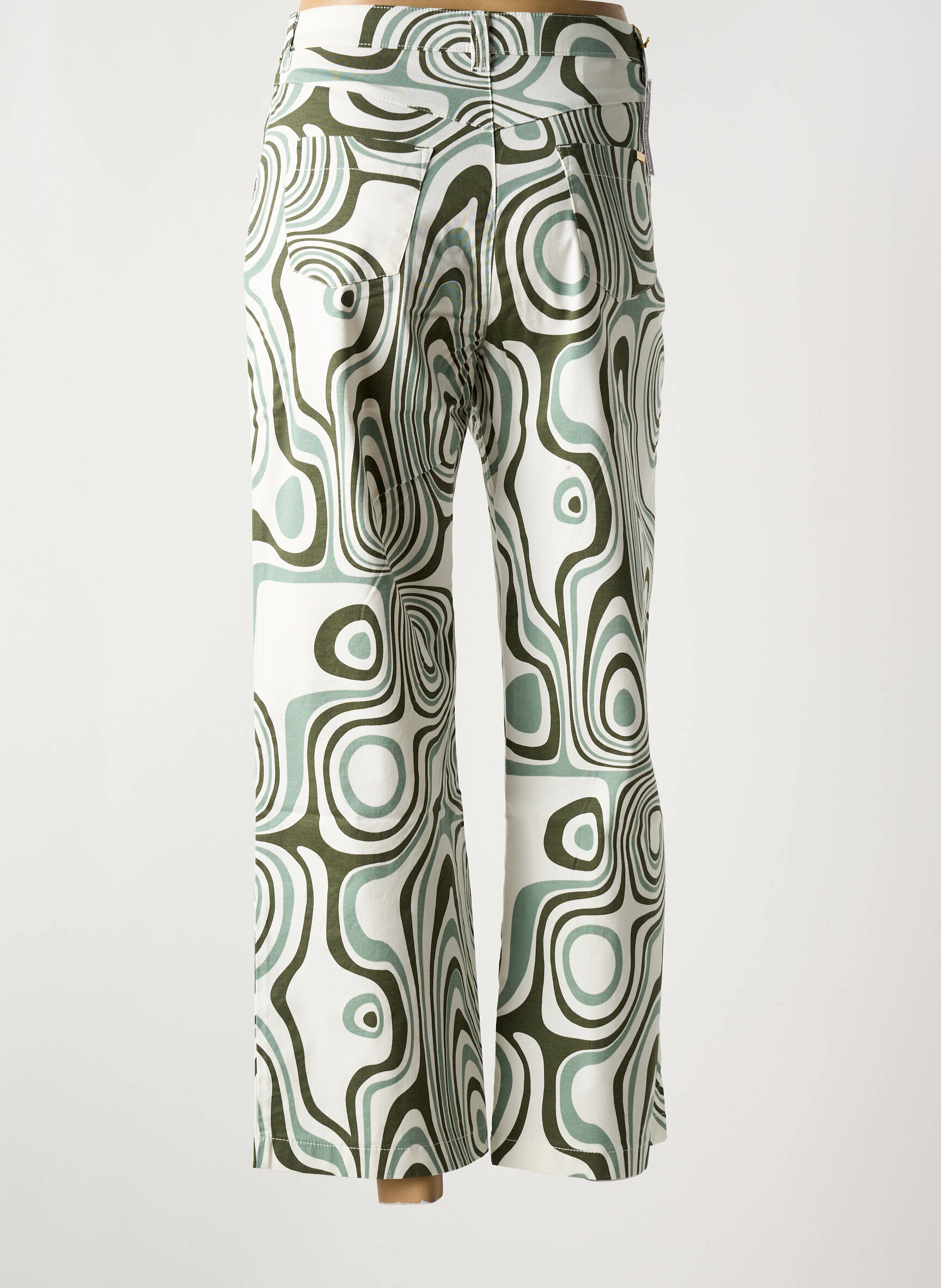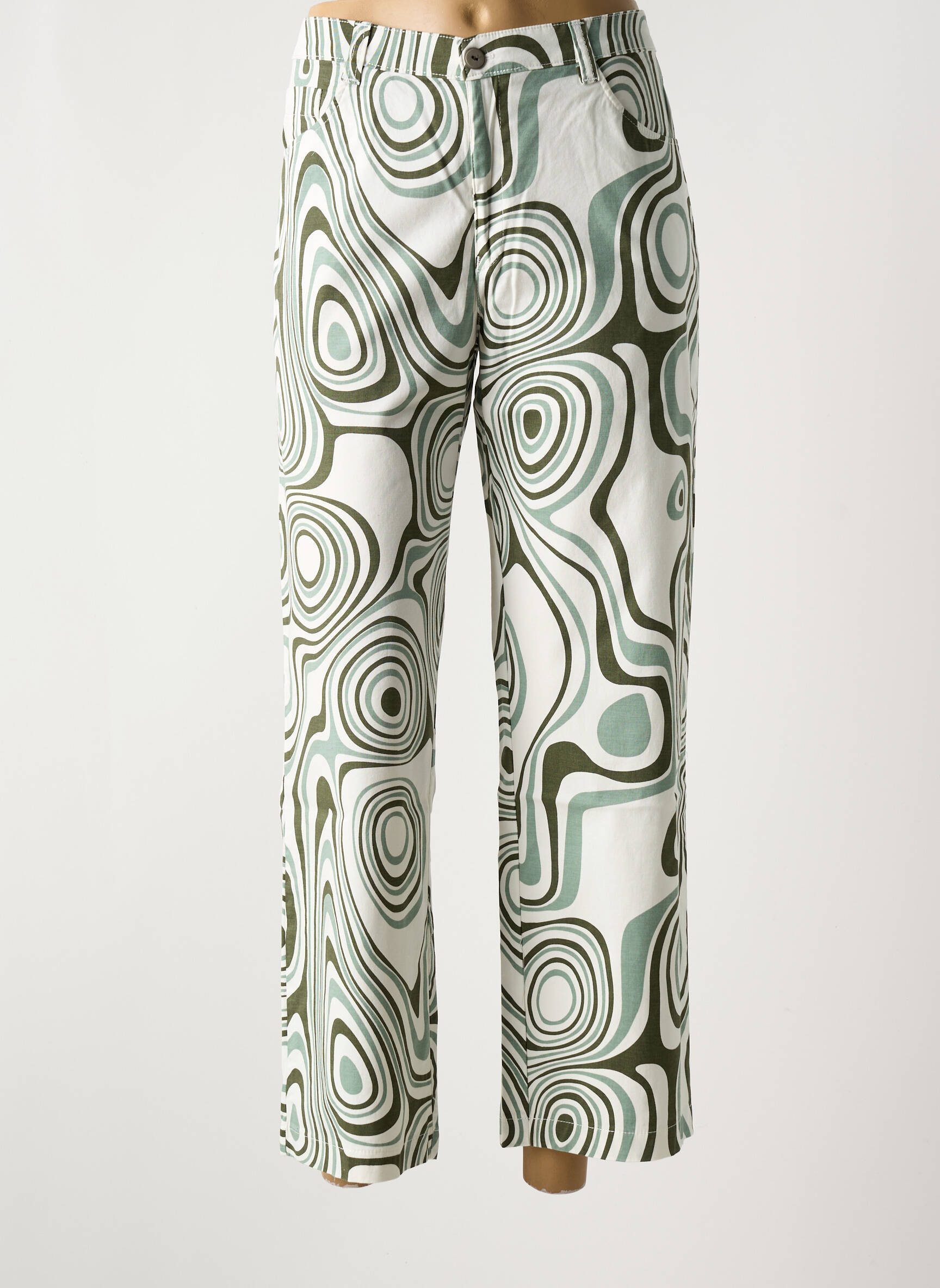 Craquez pour ce pantalon 7/8 WALTRON pour femme, une véritable opportunité pour apporter une touche graphique à votre dressing sans vous ruiner. Son imprimé hypnotique aux motifs ondulés dans les tons verts et blancs vous assure un look original et tendance, parfait pour celles qui aiment se démarquer tout en profitant d’un prix mini. Ce pantalon combine coupe moderne et motif audacieux, faisant de lui un indispensable à prix d’ami pour renouveler votre garde-robe à moindre coût.