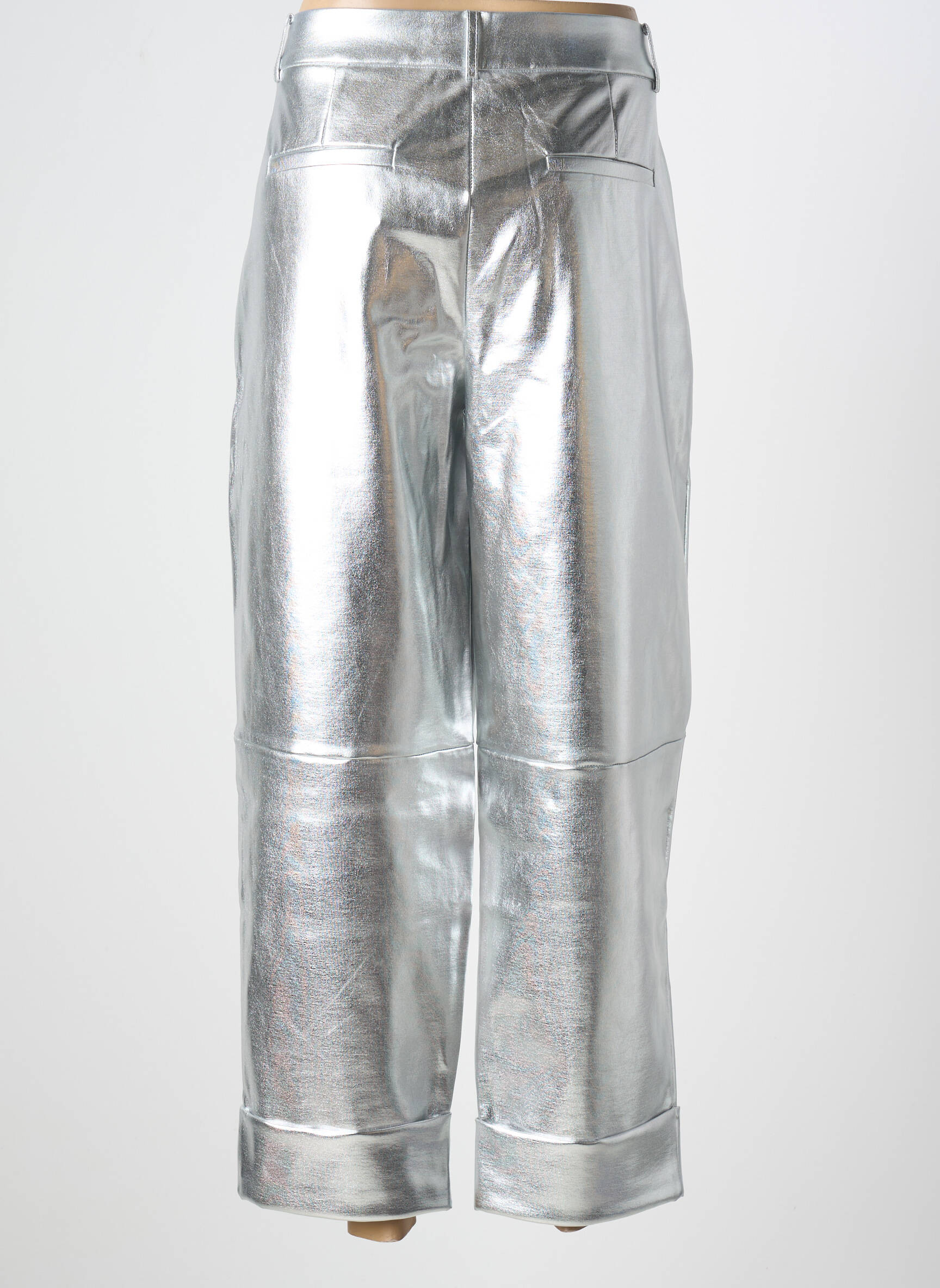 Pour porter ce pantalon argenté, misez sur un haut simple comme un t-shirt blanc ou une chemise fluide pour équilibrer l’ensemble, ou osez le contraste avec un pull noir pour une allure chic et graphique. Côté chaussures, des baskets blanches apporteront une touche décontractée, tandis que des bottines ou des sandales à talons accentueront l’effet sophistiqué. Pensez à ajouter une pochette discrète ou un sac à main minimaliste et quelques bijoux délicats pour sublimer la brillance sans en faire trop. Ce pantalon se marie aussi parfaitement avec une veste ajustée pour une silhouette urbaine et tendance.