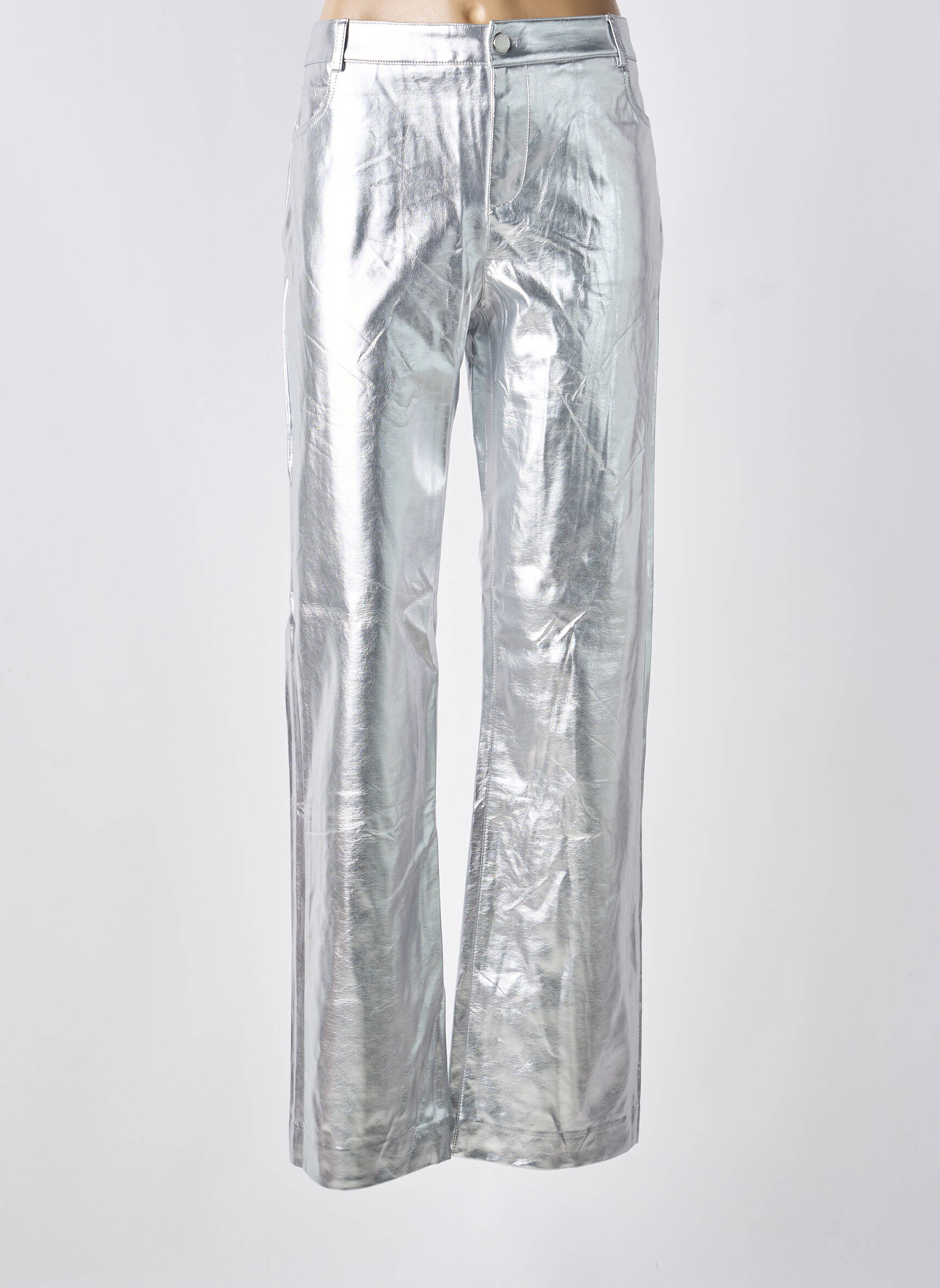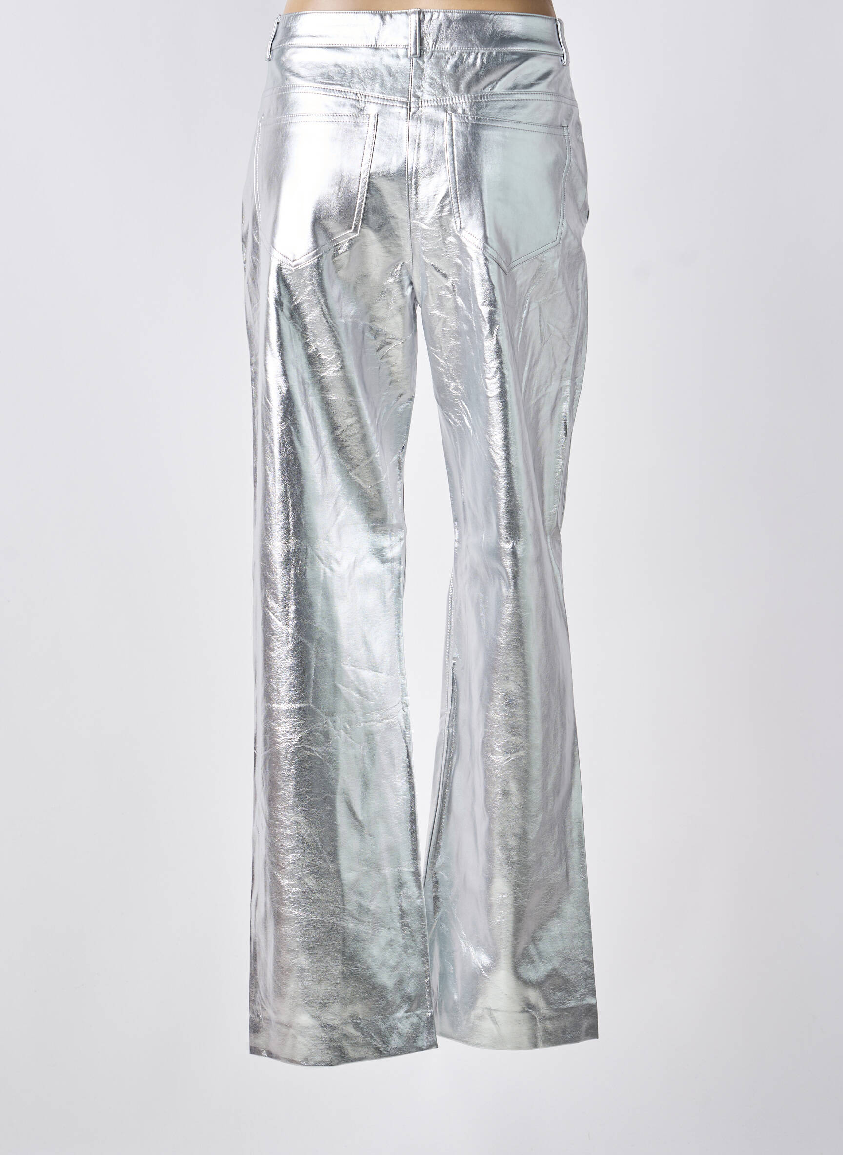 Pour un look moderne et assumé, tu peux porter ce pantalon avec un simple t-shirt blanc ou un pull en maille léger pour jouer sur le contraste et laisser le pantalon s’exprimer. Ajoute une paire de baskets pour une allure décontractée ou mise sur des bottines à talon pour un style plus sophistiqué. N’hésite pas à ajouter une veste noire ou un blazer oversize pour une touche chic, et quelques accessoires discrets qui mettront en valeur l’effet métallisé sans en faire trop.