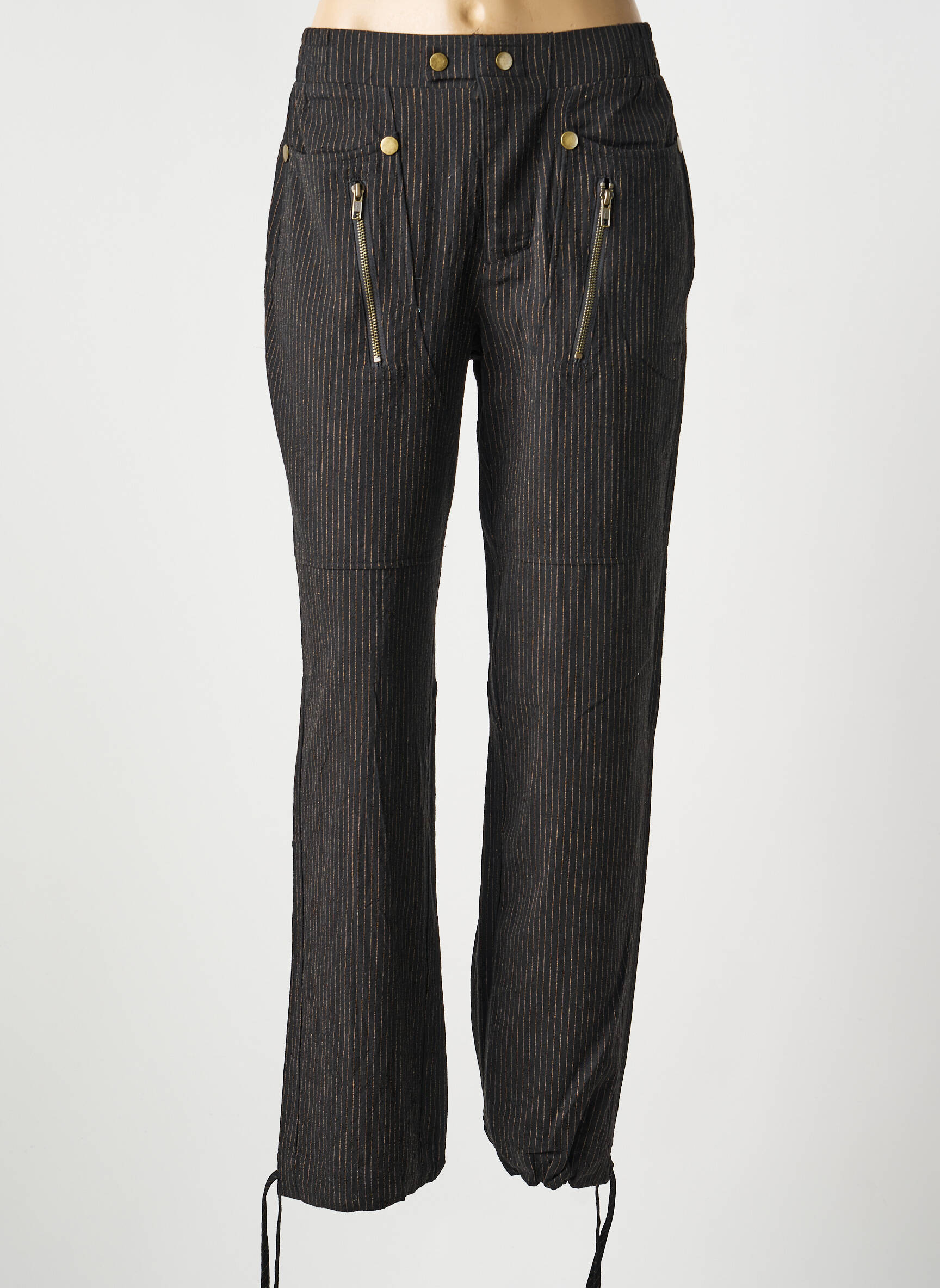 Profitez d'un vrai bon plan avec ce pantalon droit NU JEANS pour femme, une pièce incontournable qui combine style moderne et confort au quotidien. Son tissu à fines rayures souligne une allure élégante tandis que les zips métalliques sur les poches apportent une touche contemporaine très tendance. Les boutons dorés et les bas de jambes resserrables ajoutent un détail original qui fait la différence, tout ça à petit prix pour se faire plaisir sans compromis sur le style et l’économie.