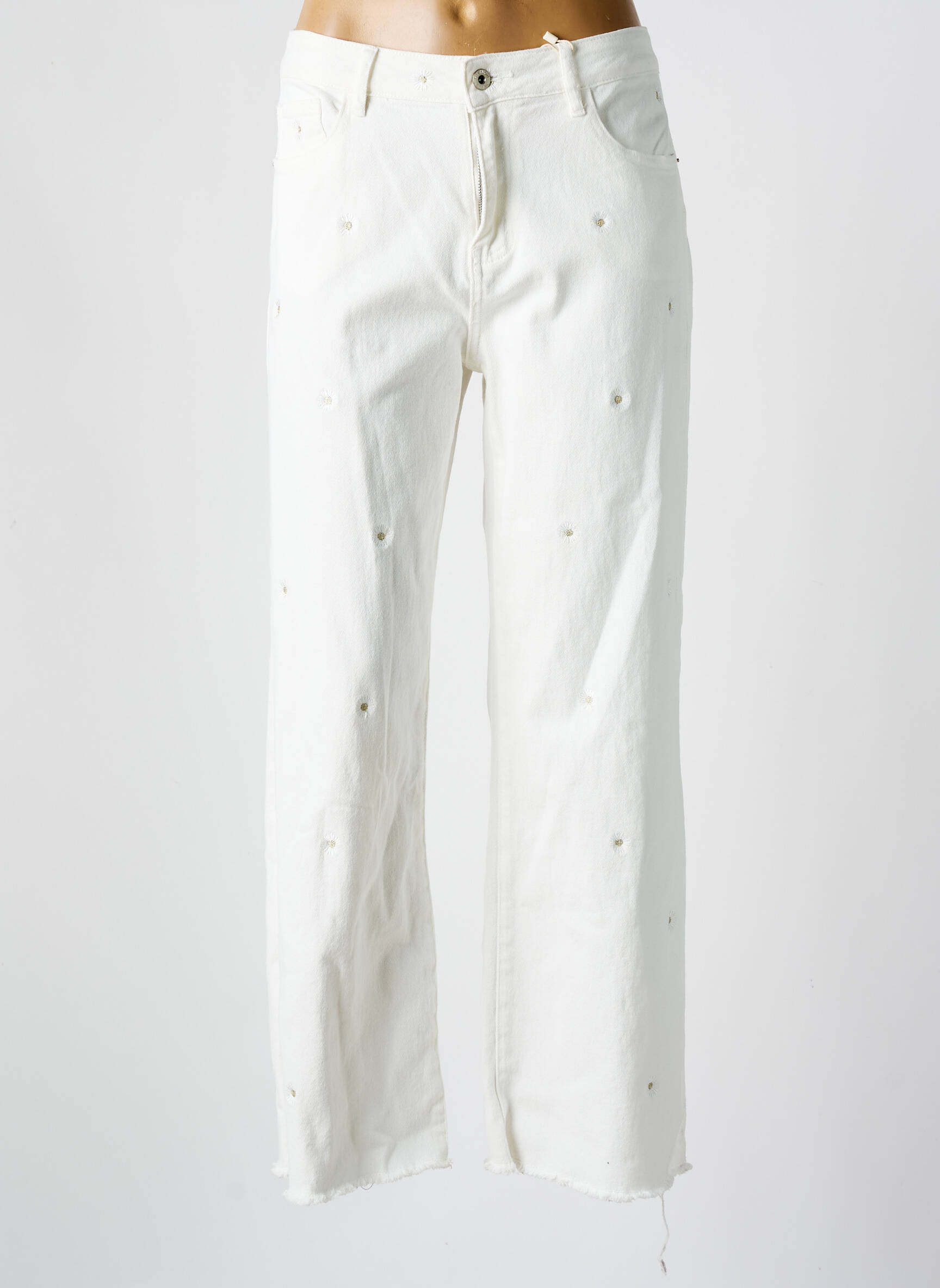 Profitez d’un vrai bon plan avec ce pantalon droit pour femme signé ONADO, une pièce tendance à prix mini qui apportera une touche d’originalité à votre dressing. Sa coupe droite intemporelle, sa couleur blanche élégante rehaussée de petits détails brodés et ses bas effilochés offrent une allure à la fois moderne et décontractée, idéale pour composer facilement vos looks de saison sans vous ruiner.