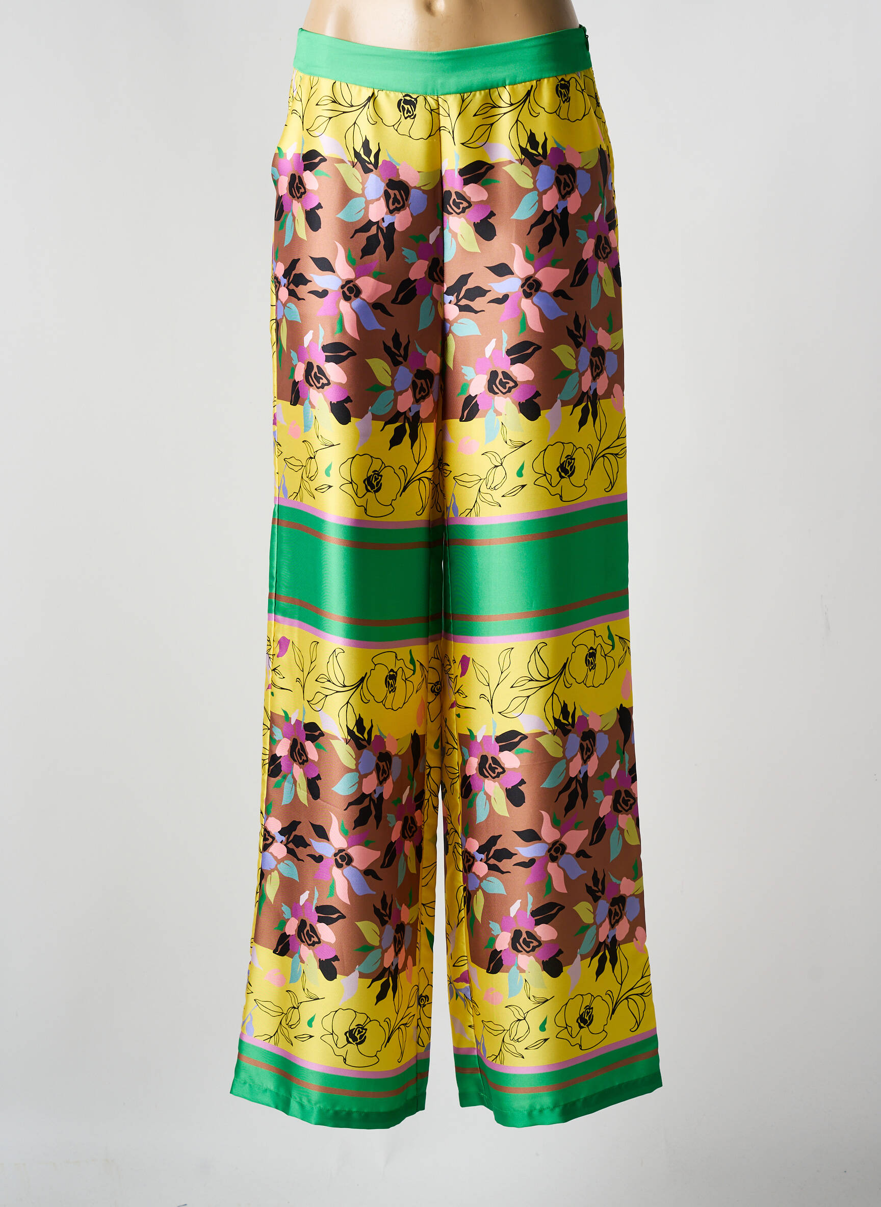 Craquez pour ce pantalon large pour femme de la marque GAUDI à prix mini, idéal pour colorer votre garde-robe sans vous ruiner. Sa coupe ample offre une allure décontractée et élégante, sublimée par un motif floral vif sur fond jaune et vert qui ne passera pas inaperçu. Sa taille élastiquée assure un confort optimal et son tissu fluide tombe parfaitement, pour une touche chic et légère à petit prix, parfait pour un look tendance sans compromis sur l’économie.