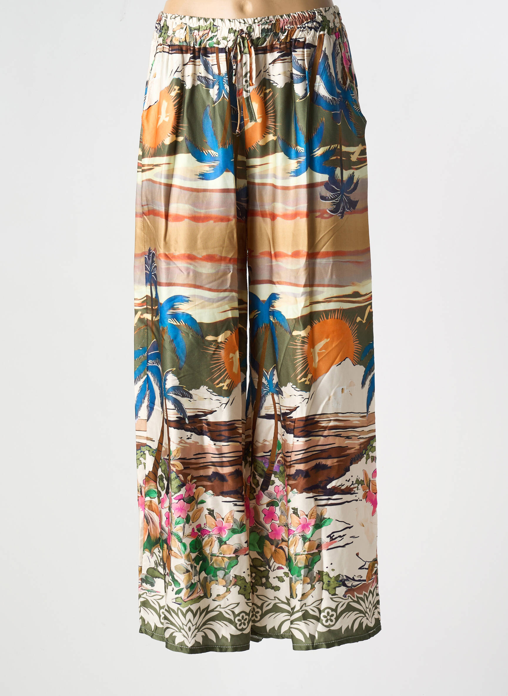 Ce pantalon s’accorde facilement avec un débardeur uni ou un top léger pour équilibrer son motif audacieux et mettre en valeur sa silhouette ample. Il se porte aussi bien avec des sandales plates lors des journées ensoleillées qu’avec des espadrilles compensées pour un look plus sophistiqué. Pour compléter la tenue, une veste en jean ou un gilet fin viendront apporter la touche finale sans alourdir l’ensemble, le tout rehaussé de bijoux dorés ou de lunettes de soleil pour une allure détendue et tendance.