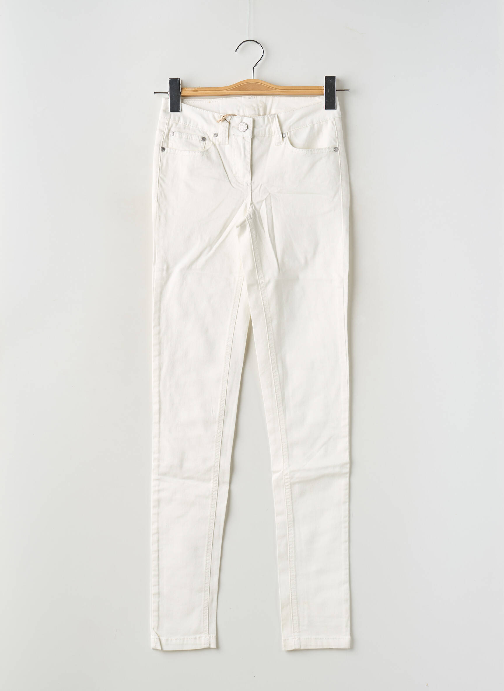 Ce pantalon slim blanc se marie facilement avec un top coloré ou une blouse fluide pour un contraste élégant, et s’accorde aussi très bien avec une veste en jean ou un blazer pour un look plus structuré. On peut compléter la tenue avec des baskets pour une allure décontractée ou des sandales à talons pour une note plus chic, sans oublier quelques accessoires dorés pour sublimer l’ensemble.