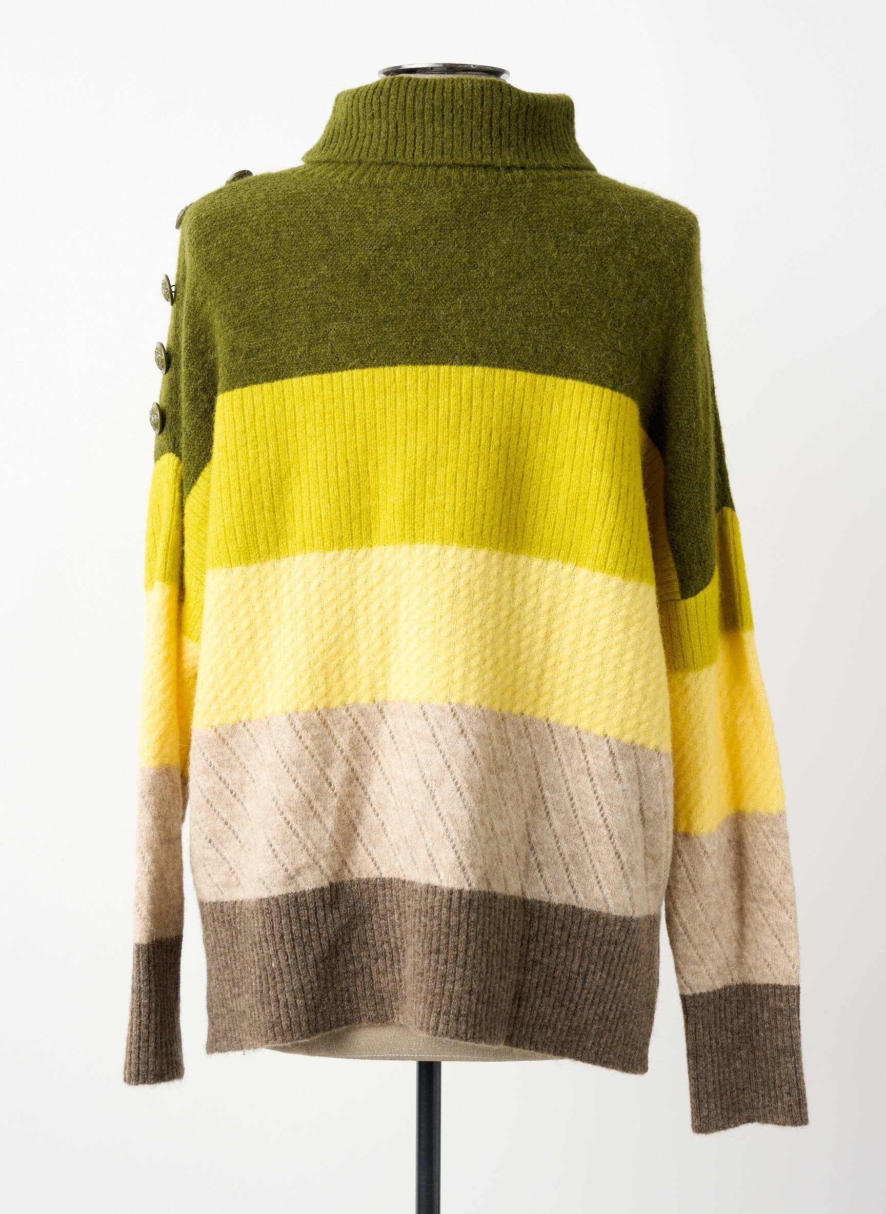 Craquez pour ce pull col roulé ANANKE pour femme, un véritable bon plan mode avec son allure moderne et ses larges rayures aux teintes naturelles allant du vert olive au beige. Ce modèle à petit prix se distingue par sa coupe confortable et ses boutons sur l’épaule, ajoutant une note tendance et originale à votre tenue, tout en vous offrant douceur et chaleur sans vous ruiner.