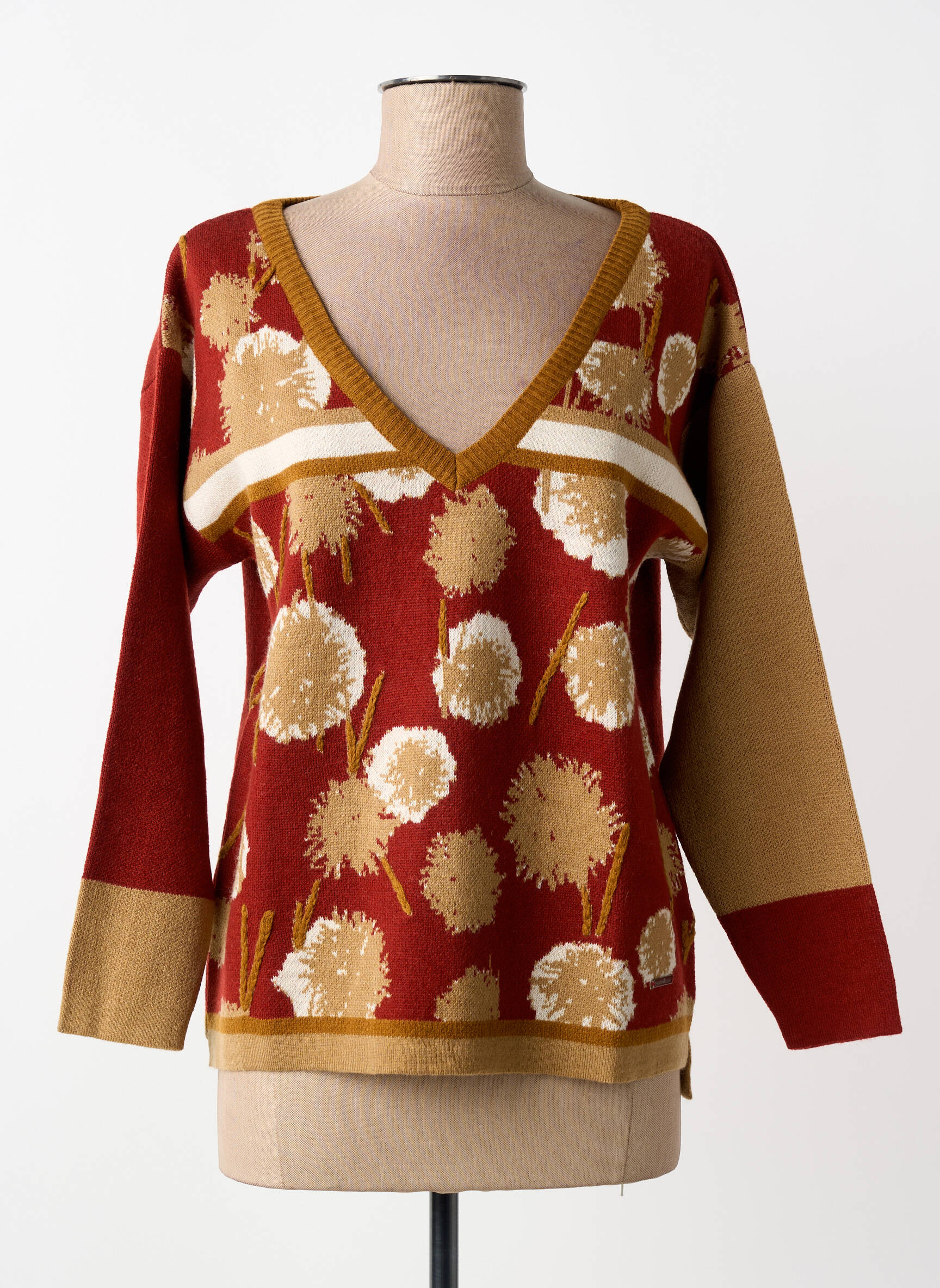 Craquez pour ce pull de la marque AGATHE & LOUISE à prix malin, parfait pour celles qui recherchent une touche d’originalité sans se ruiner. Son design unique allie un joli jeu de couleurs automnales avec de larges motifs floraux écrus et beiges sur fond bordeaux, rehaussés par un décolleté en V et des détails contrastés aux manches. Ce modèle tendance ajoute immédiatement du style à votre garde-robe tout en profitant d'une belle opportunité de faire des économies.