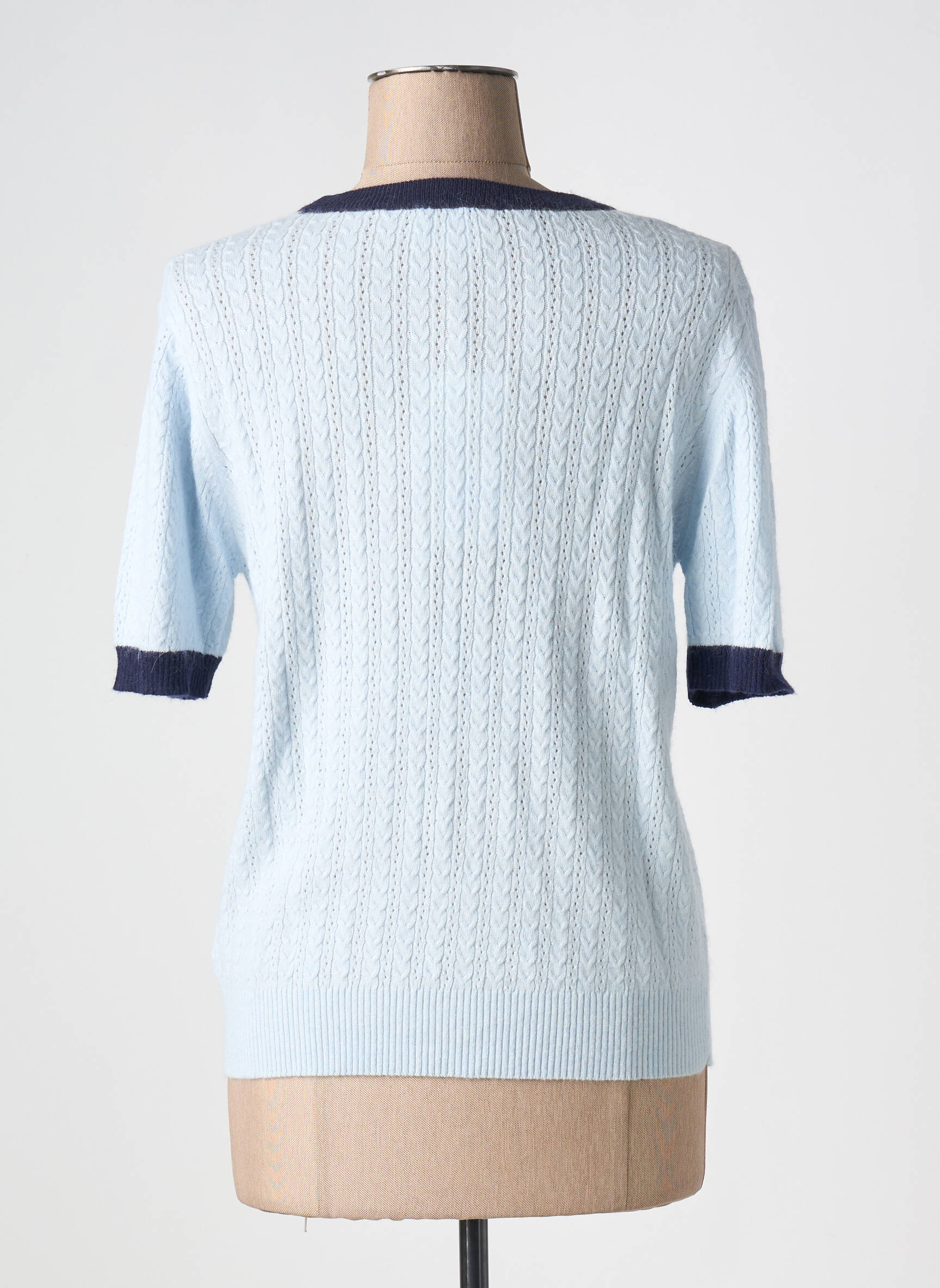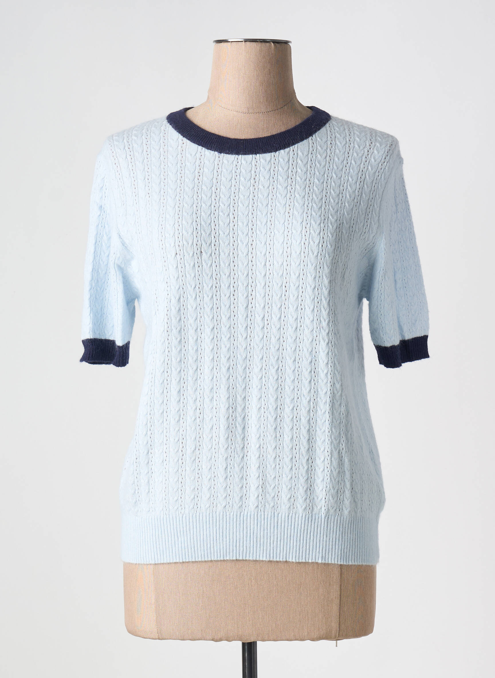 Profitez d’un bon plan sur ce pull femme de la marque ARTLOVE, à petit prix pour un style frais et tendance sans se ruiner. Ce modèle séduit par sa maille délicatement texturée couleur bleu ciel, rehaussée de liserés contrastants bleu marine au col rond et en bas des manches courtes, pour une touche raffinée et moderne. Idéal pour dynamiser votre garde-robe avec une pièce chic, confortable et accessible.