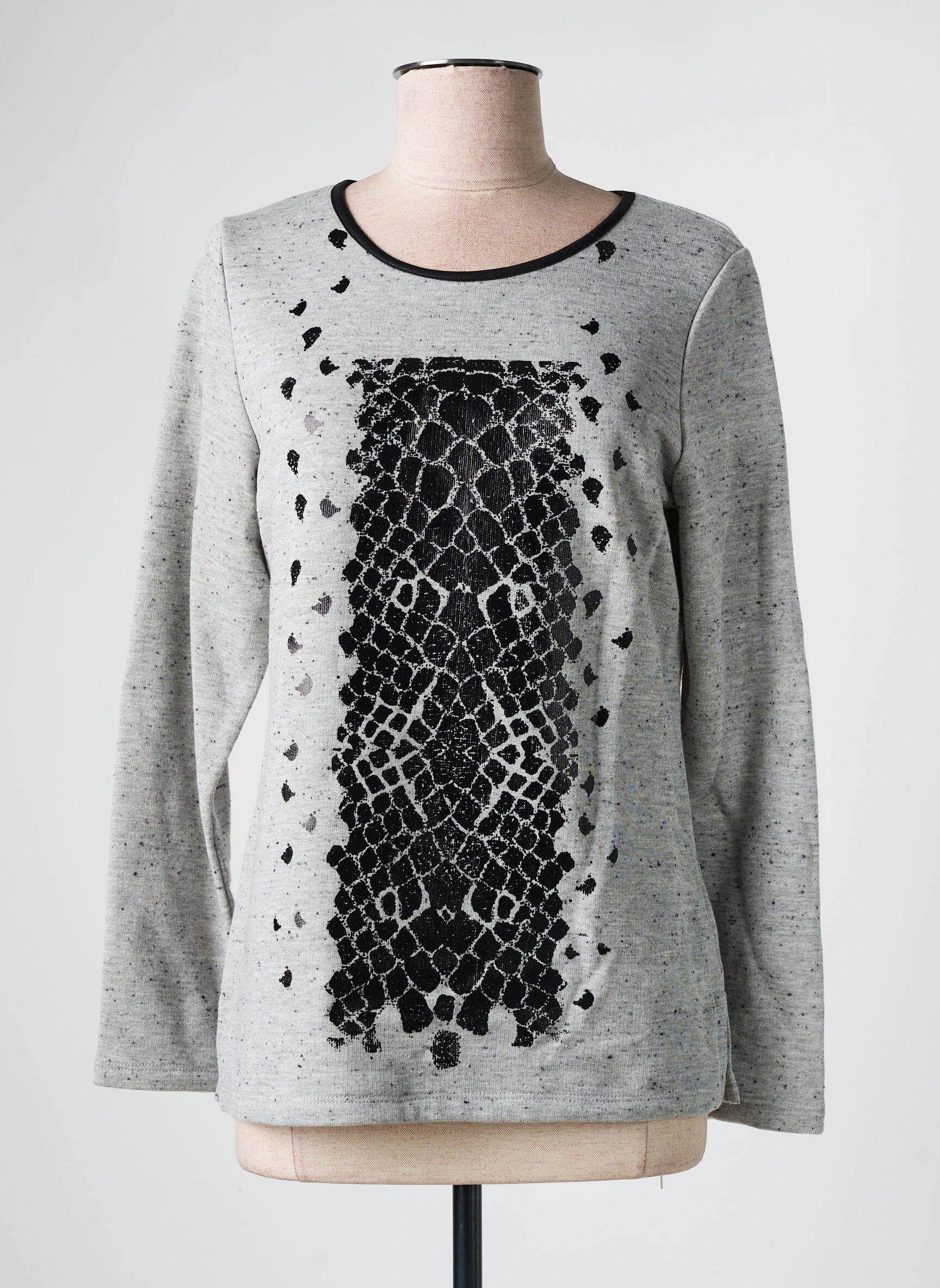 Profitez d’une offre exceptionnelle sur ce sweat-shirt pour femme signé GUY DUBOUIS, idéal pour ajouter une touche originale à votre garde-robe sans vous ruiner. Son coloris gris chiné intemporel est rehaussé par un motif graphique façon effet peau de serpent en noir sur le devant, apportant une note tendance et moderne. Les finitions soignées, comme l’encolure rond légèrement contrastée, en font une pièce facile à assortir pour un look à la fois élégant et décontracté, accessible à prix mini.