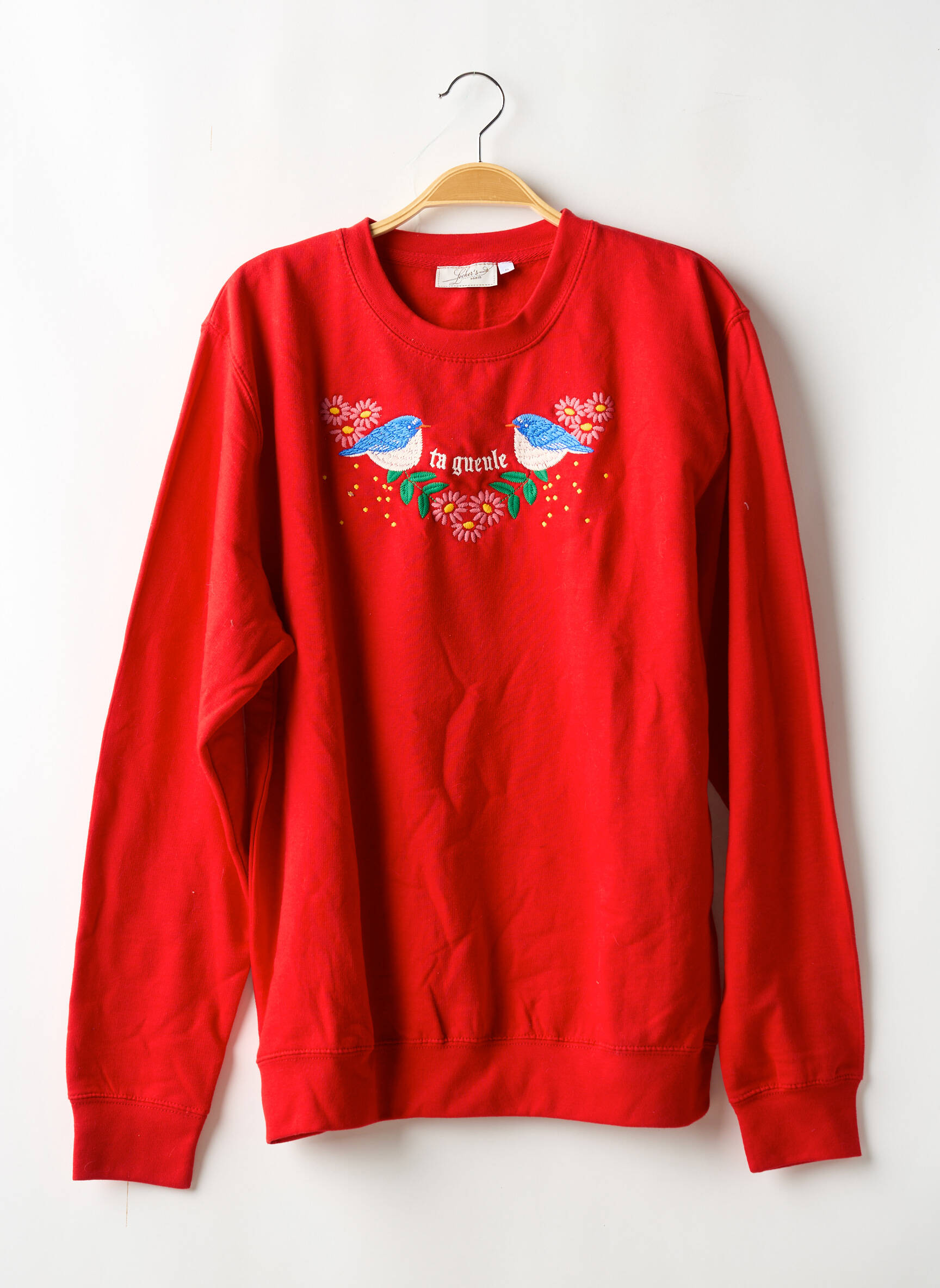 Pour un look casual et tendance, tu peux porter ce sweat-shirt avec un jean brut ou une jupe en denim, accompagné de baskets blanches pour une allure moderne et détendue. Il s’accorde aussi parfaitement avec un pantalon noir ajusté et des boots pour une touche un peu plus chic, ou même glissé sous une veste en cuir pour casser les codes et ajouter du caractère à ta tenue. N’hésite pas à jouer avec les accessoires colorés, comme un sac à bandoulière ou un foulard, pour rappeler les détails de la broderie et sublimer ton style au quotidien sans te ruiner.