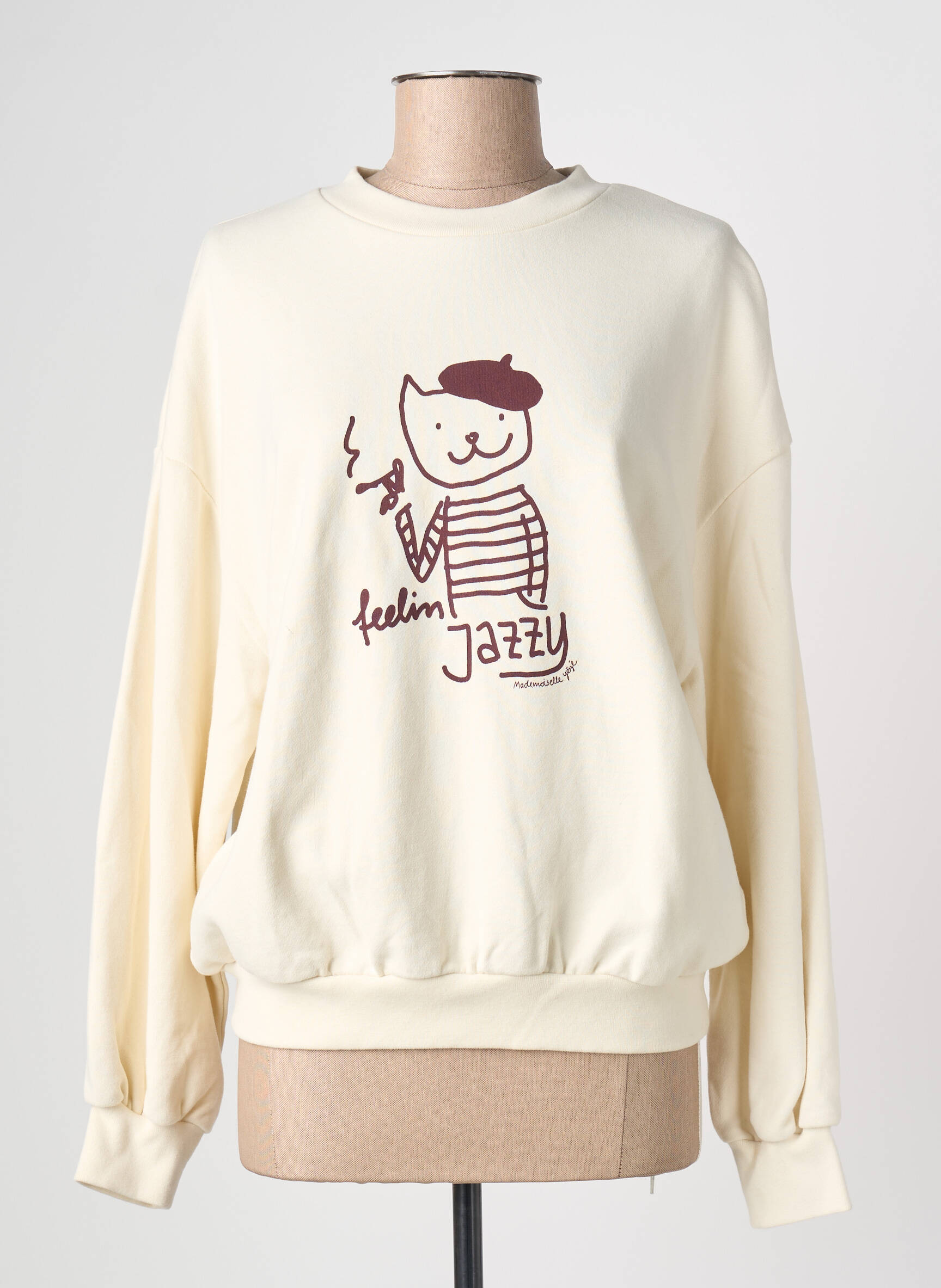 Craquez pour ce sweat-shirt femme de chez MADEMOISELLE YEYE, une pièce au style original et doux à prix réduit, parfait pour donner une touche décalée à votre garde-robe sans vous ruiner. Son illustration féline façon jazzy et son coloris crème apportent une note rétro pleine de bonne humeur, idéale pour rester tendance tout en profitant d’un bon plan exclusif.