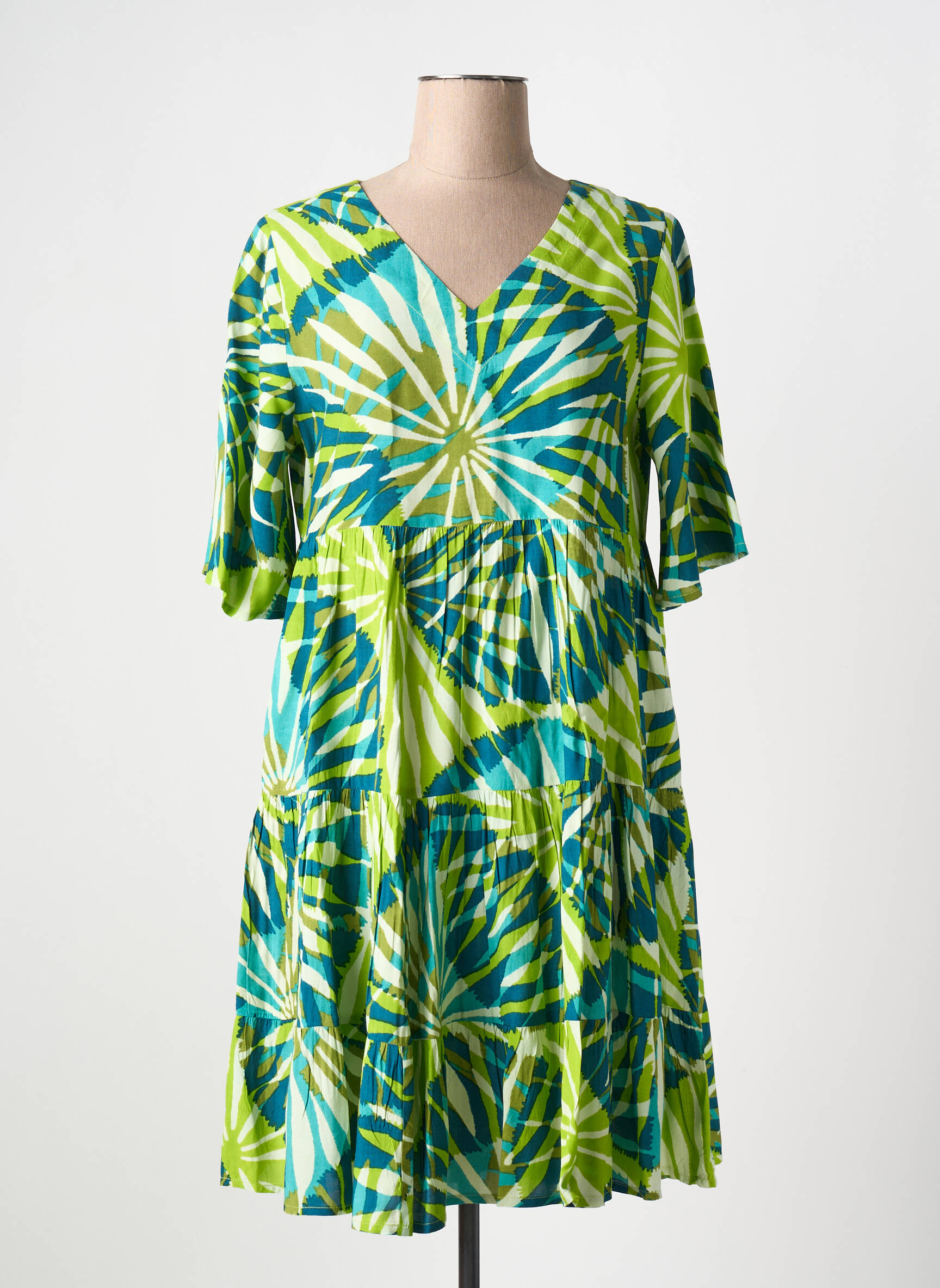 Profitez d’une véritable opportunité avec cette robe courte signée AGATHE & LOUISE, idéale pour donner du pep’s à votre garde-robe sans vous ruiner. Avec son imprimé graphique aux teintes fraîches de vert et de bleu, sa coupe ample et son décolleté en V élégant, cette pièce vous assure un look tendance et coloré à prix cassé, parfait pour l’été ou un week-end en ville.