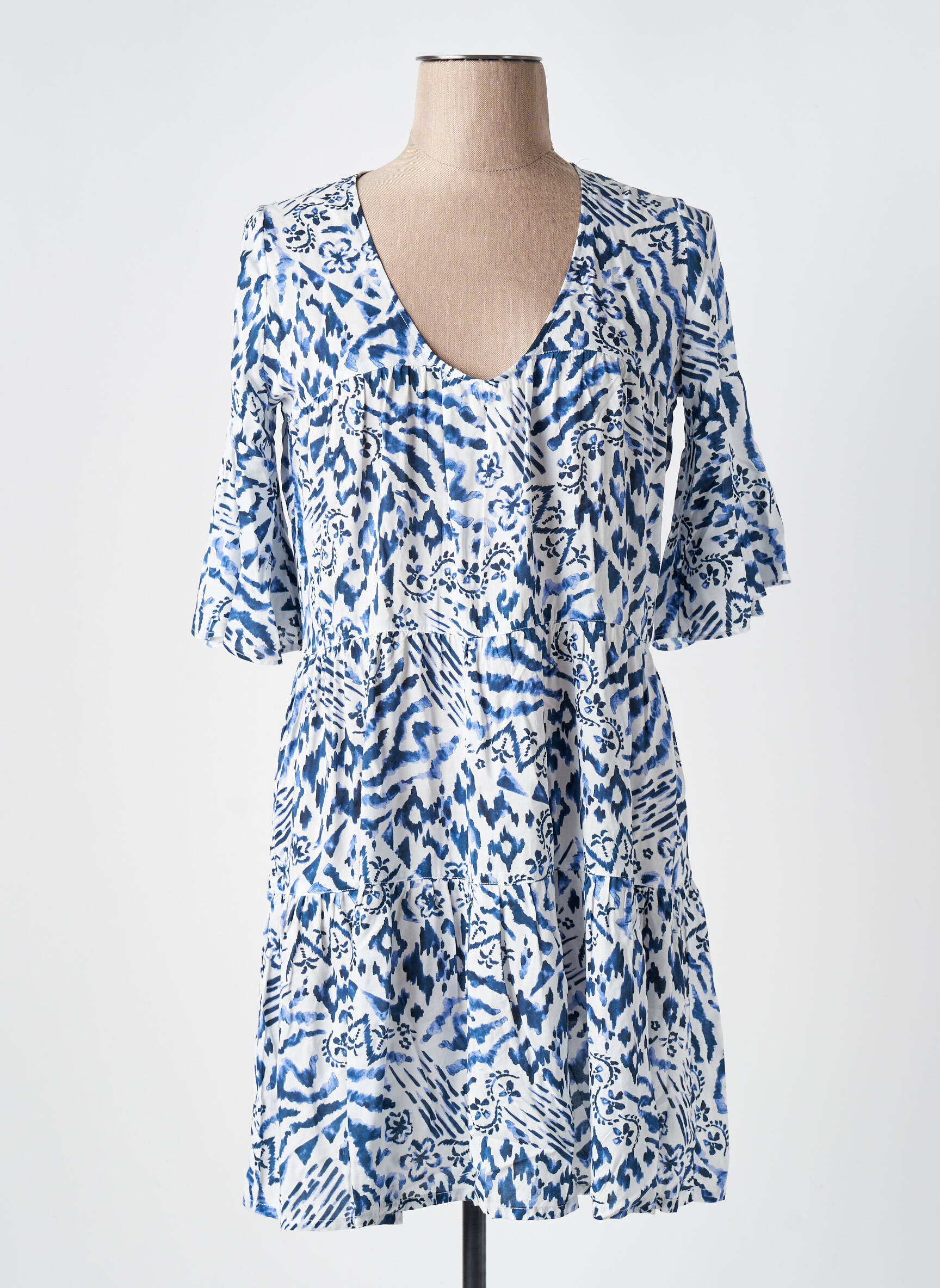Craquez pour cette robe courte BANANA MOON à prix tout doux, parfaite pour celles qui veulent se faire plaisir sans se ruiner. Son imprimé bleu et blanc d’inspiration graphique apporte une touche de fraîcheur et de modernité, tandis que sa coupe fluide et son encolure en V mettent joliment la silhouette en valeur. Idéale pour les journées ensoleillées ou pour un look décontracté chic, c’est le bon plan mode du moment à ne pas laisser passer.