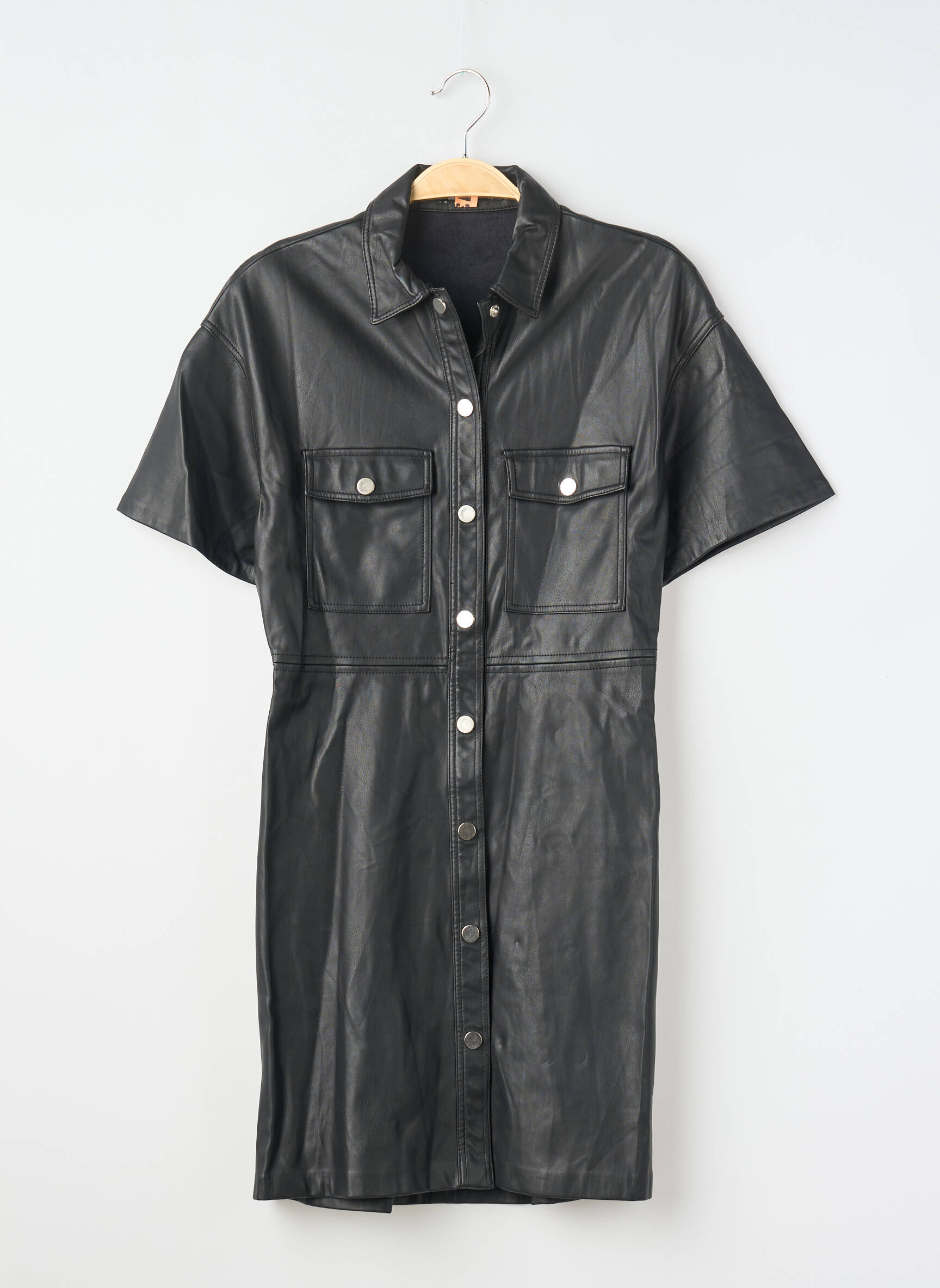 Profitez d’une véritable opportunité mode à petit prix avec cette robe courte pour femme signée BERSHKA, qui séduit par son look tendance façon cuir noir, sa coupe droite facile à porter et son boutonnage central très pratique. Les détails de poches à rabat sur la poitrine et les manches courtes ajoutent une touche moderne et décontractée, idéale pour mettre votre silhouette en valeur sans vous ruiner.