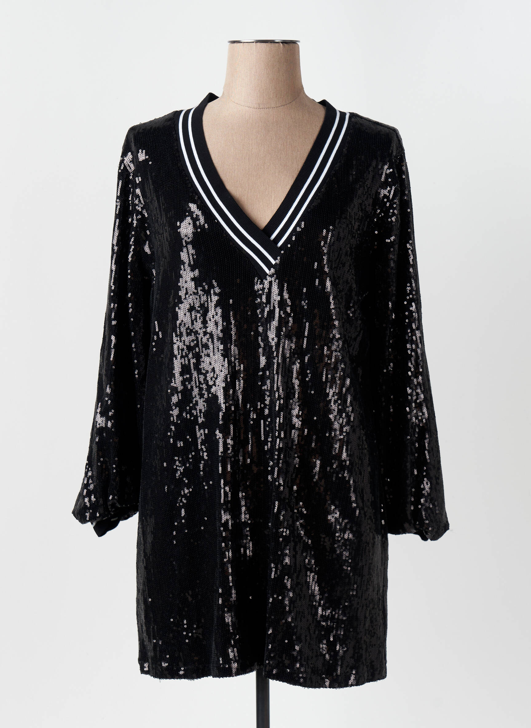 Profitez d'une opportunité exceptionnelle pour vous offrir une robe courte signée CIVICO 1 à prix tout doux, idéale pour illuminer vos soirées sans vous ruiner. Ce modèle séduit par son tissu noir recouvert de sequins effet miroir qui capte la lumière à chaque mouvement, tandis que son col en V doublement souligné d’un liseré blanc et noir ajoute une touche sport-chic ultra tendance. Les manches longues et la coupe fluide offrent un confort parfait et une allure moderne, pour un look élégant à petit prix.
