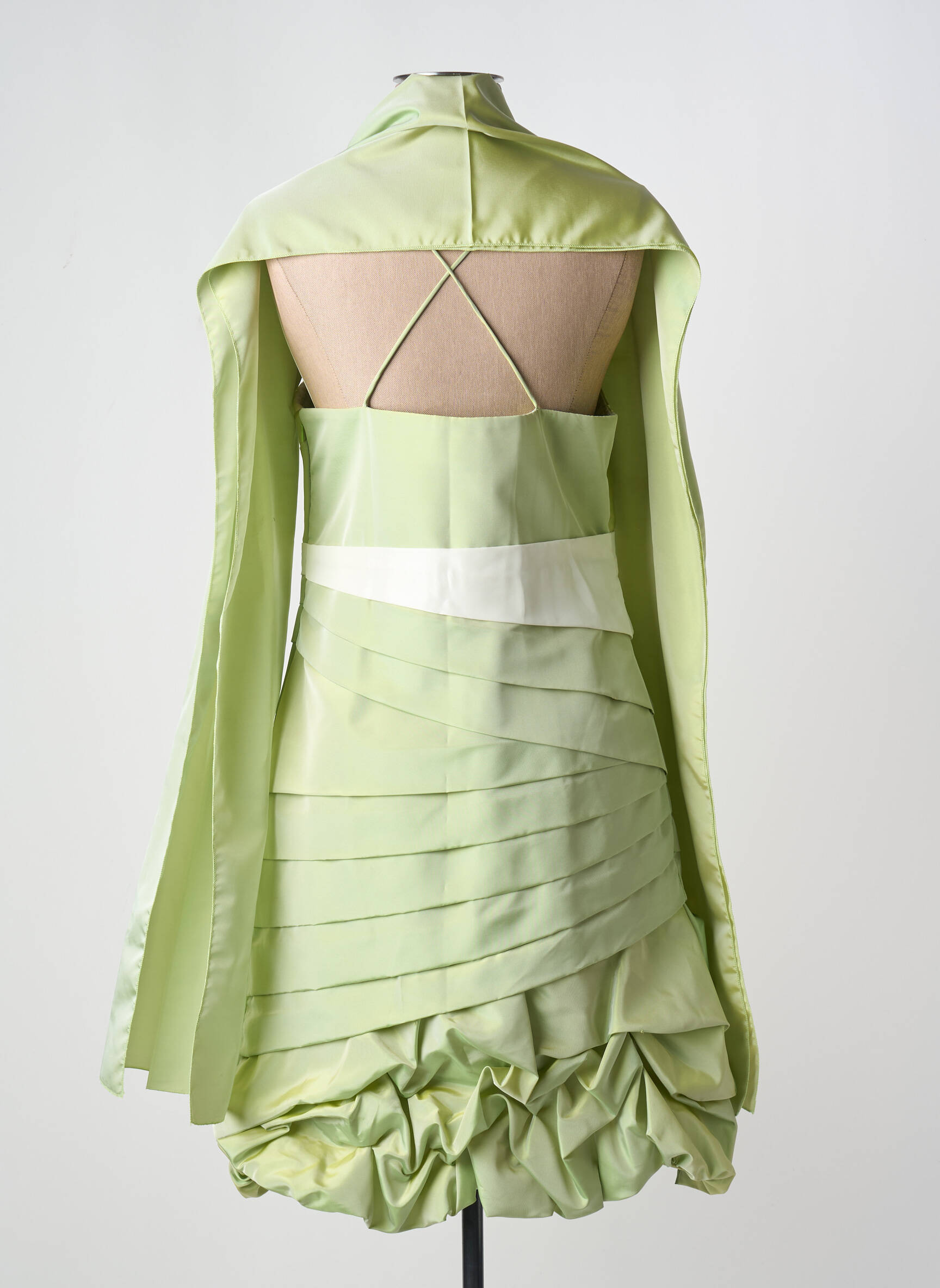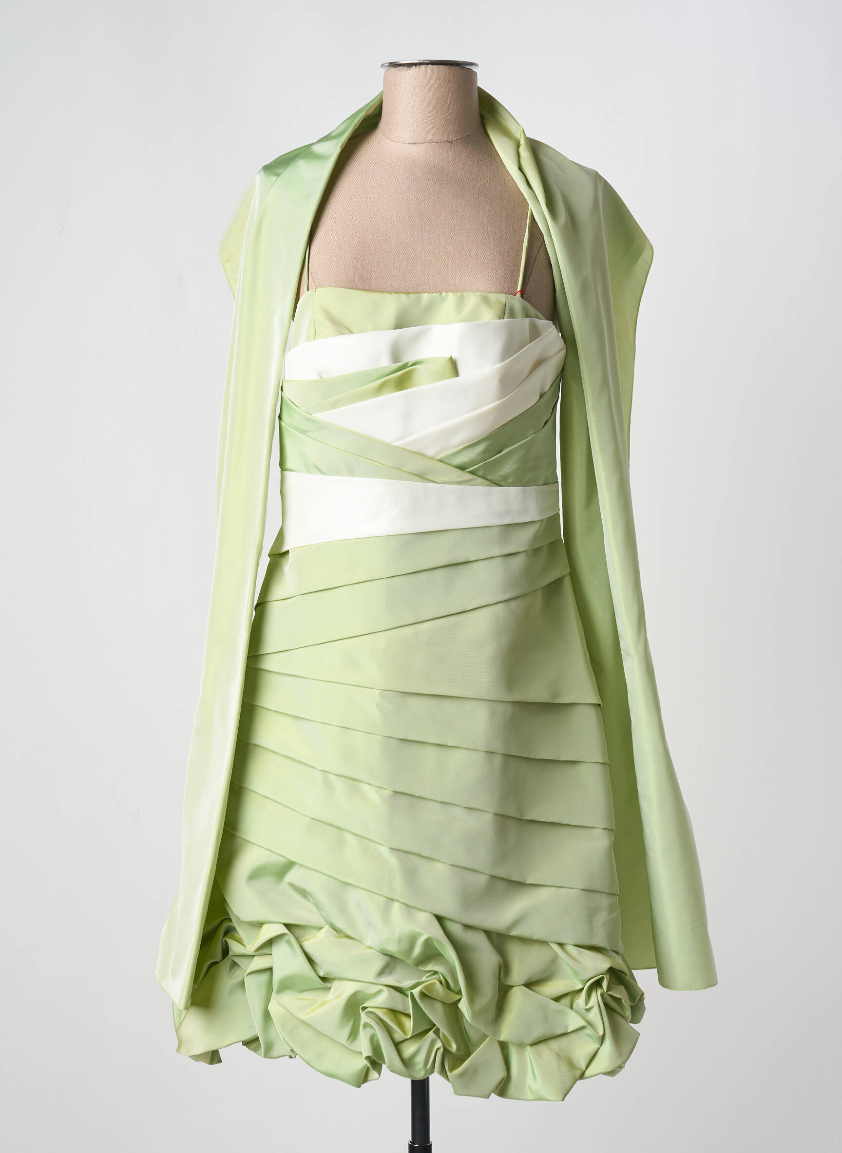 Profitez d’un bon plan mode avec cette robe courte CREATIF PARIS, idéale pour briller lors de vos occasions spéciales sans vous ruiner. Sa teinte vert pastel rehaussée de bandes blanches apporte une touche d’originalité tandis que la coupe bustier sublime la silhouette. Les plis horizontaux et le bas du modèle à effet bouillonné donnent du caractère à la tenue, accompagnée de son étole assortie pour une allure raffinée à petit prix.