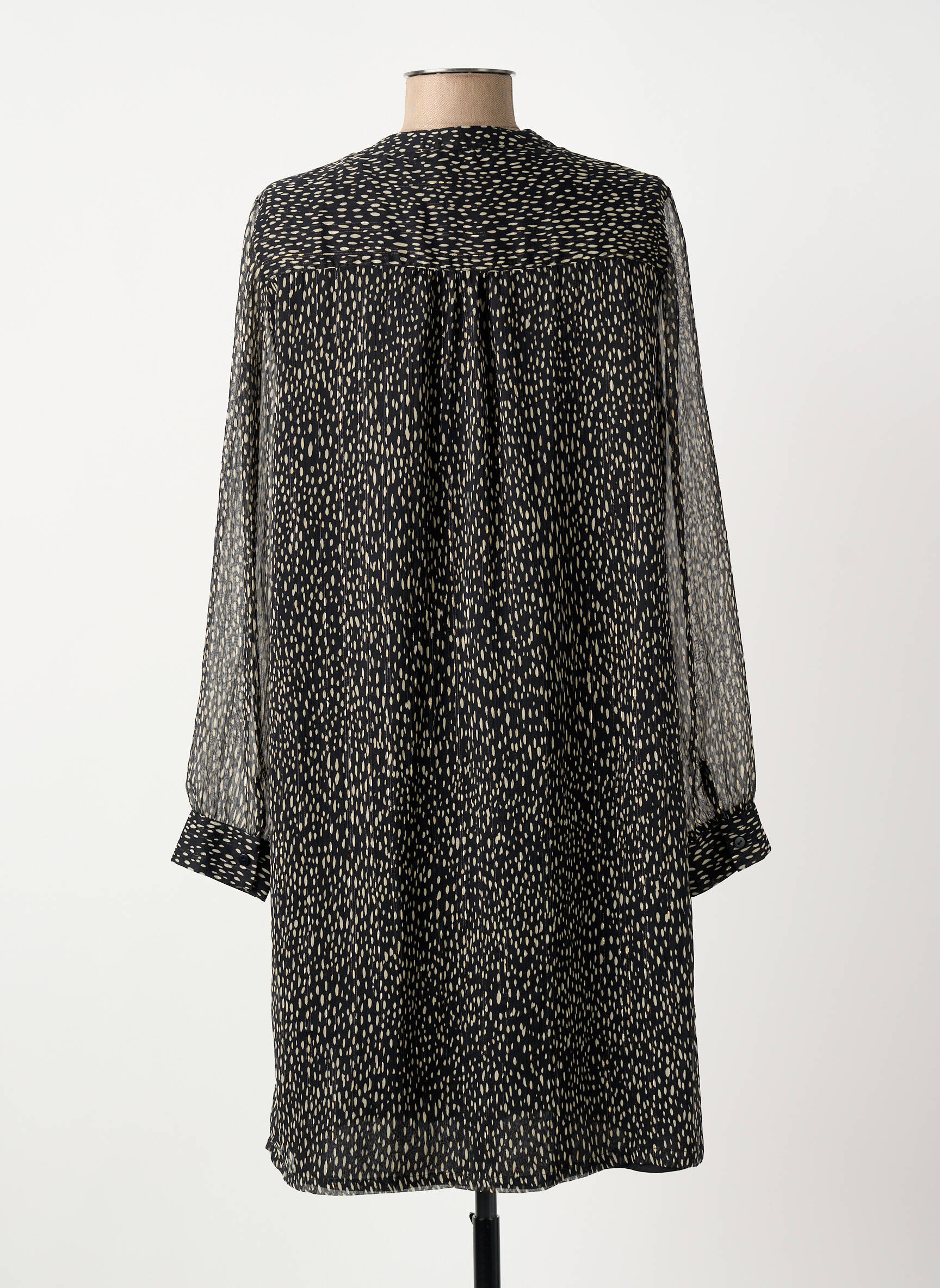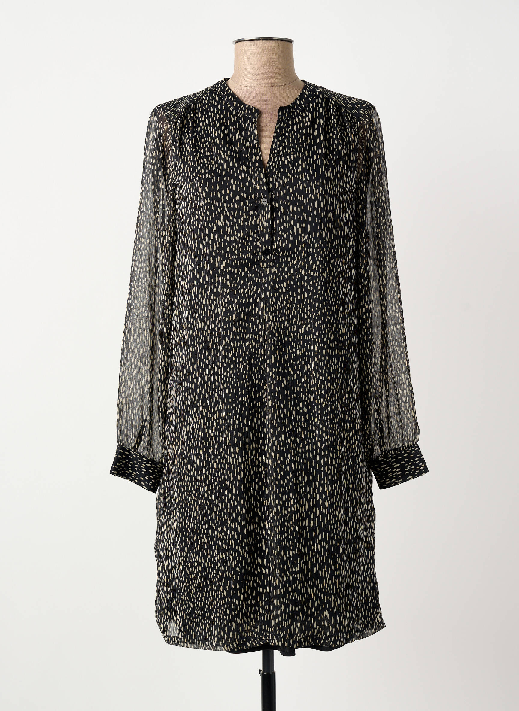 Craquez pour cette robe courte ELORA à petit prix, parfaite pour apporter une touche d’élégance discrète à votre garde-robe sans vous ruiner. Son imprimé délicat et raffiné joue sur des nuances de noir et blanc, tandis que la coupe fluide, complétée par des manches longues transparentes et un joli col fendu, sublime toutes les silhouettes avec modernité et légèreté. Profitez d’une occasion unique d’adopter une pièce tendance signée ELORA à prix réduit, idéale pour toutes vos sorties ou réunions entre amis.