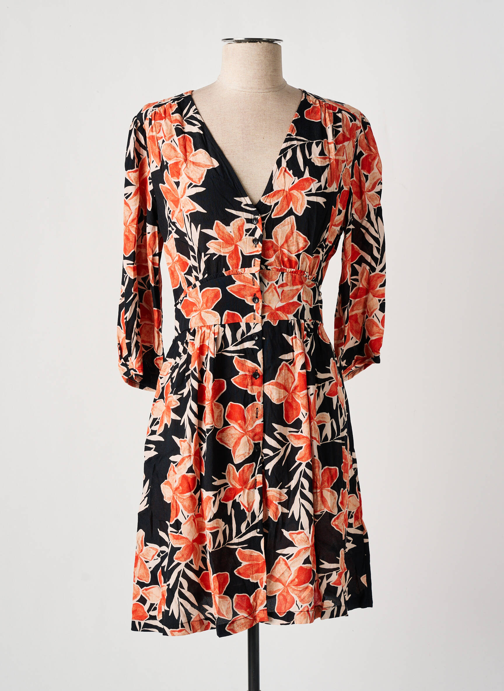 Craquez pour cette jolie robe courte Grace & Mila à prix tout doux, idéale pour ajouter une touche de fraîcheur à votre garde-robe sans vous ruiner. Son imprimé fleuri aux tons orangés illumine le fond noir du tissu, tandis que sa coupe féminine à manches trois-quarts et son joli décolleté en V mettent parfaitement la silhouette en valeur. C’est le bon plan mode à ne pas manquer pour un style tendance à petit prix !