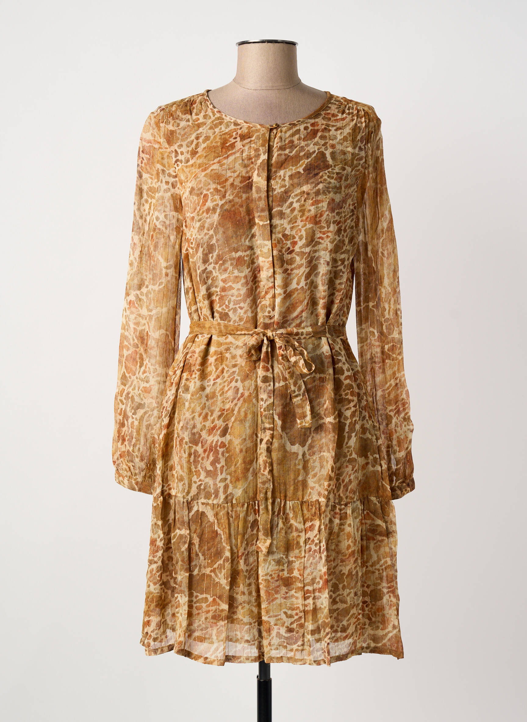 Craquez pour cette robe courte INDI & COLD à prix mini, idéale pour apporter une touche de naturel et de féminité à votre garde-robe sans vous ruiner. Son imprimé aux teintes chaudes rappelle l'élégance bohème, tandis que la coupe fluide, la ceinture amovible et les manches longues légèrement transparentes créent un look à la fois chic et décontracté, parfait pour les bons plans shopping.