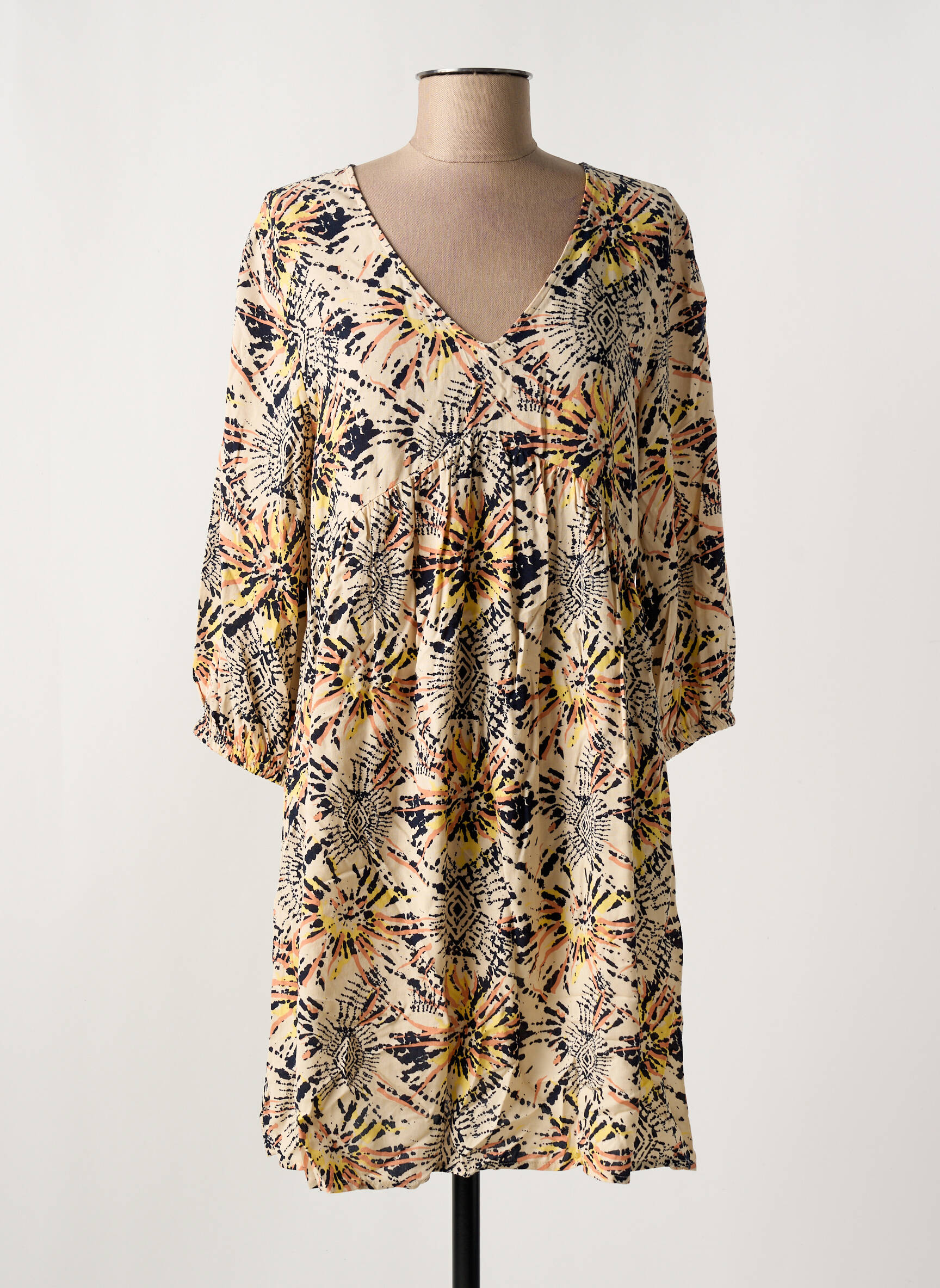 Profitez d’un vrai bon plan avec cette robe courte signée JACQUELINE DE YONG, parfaite pour ajouter une touche de fraîcheur et d’originalité à votre garde-robe sans faire exploser votre budget. Sa coupe ample et fluide met en valeur une silhouette féminine et décontractée, tandis que son imprimé dynamique aux tons beiges et jaunes apporte une note estivale pleine d’énergie. Les manches trois-quarts et le décolleté en V en font une pièce facile à porter au quotidien, que ce soit pour une sortie entre amis ou une journée au bureau, à petit prix.