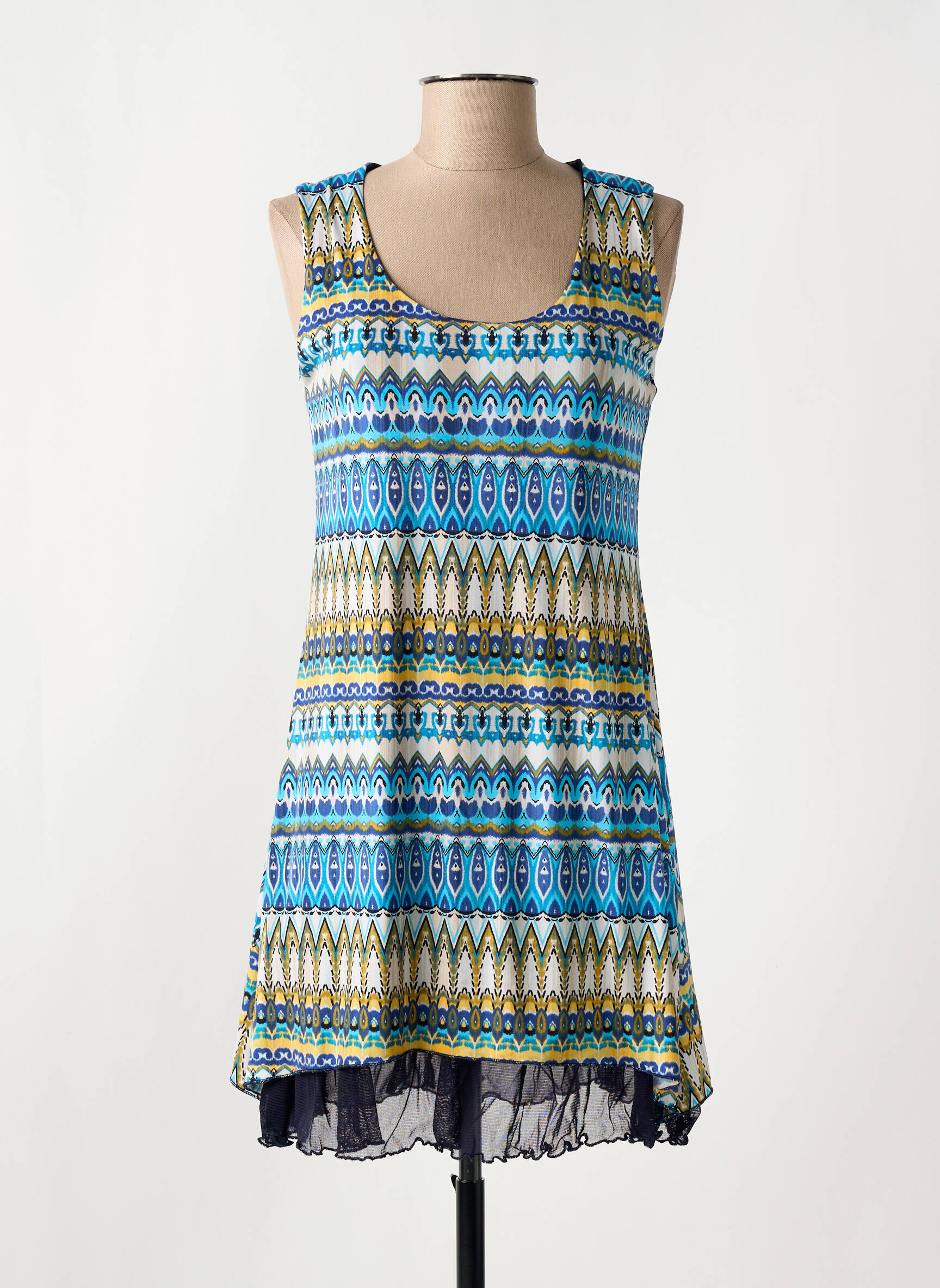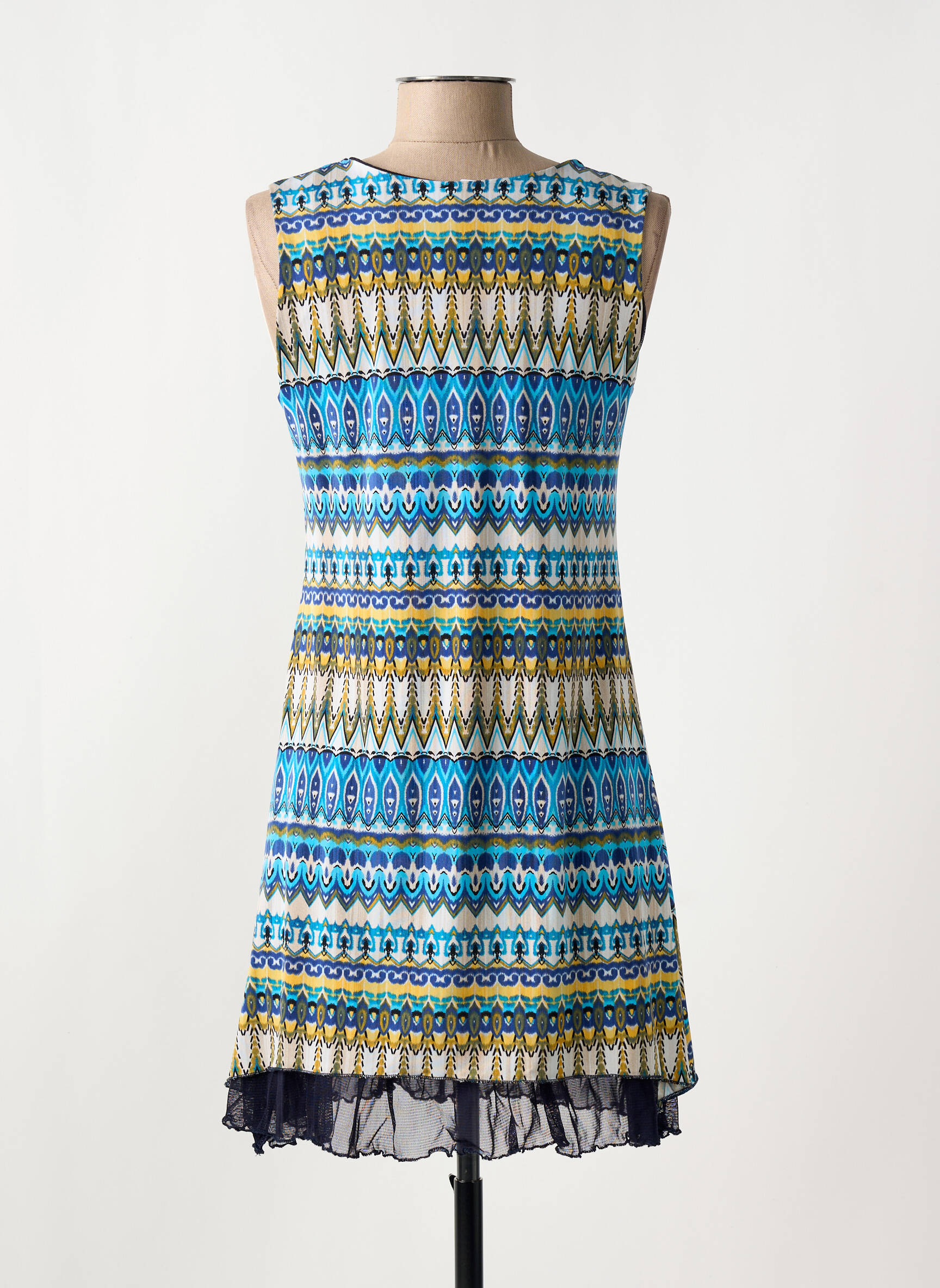 Craquez pour cette robe courte LE SINGE DE JULIE à prix mini, parfaite pour ajouter une touche de fraîcheur et d’originalité à votre garde-robe sans vous ruiner. Avec son imprimé graphique aux nuances de bleu, jaune et blanc, elle attire tous les regards tout en restant facile à porter au quotidien. Sa coupe fluide et sans manches promet une grande liberté de mouvement et un confort absolu, tandis que la finition légèrement asymétrique et le voile discret à la base apportent une note aérienne et féminine. Un vrai bon plan pour celles qui aiment se faire plaisir sans compter.