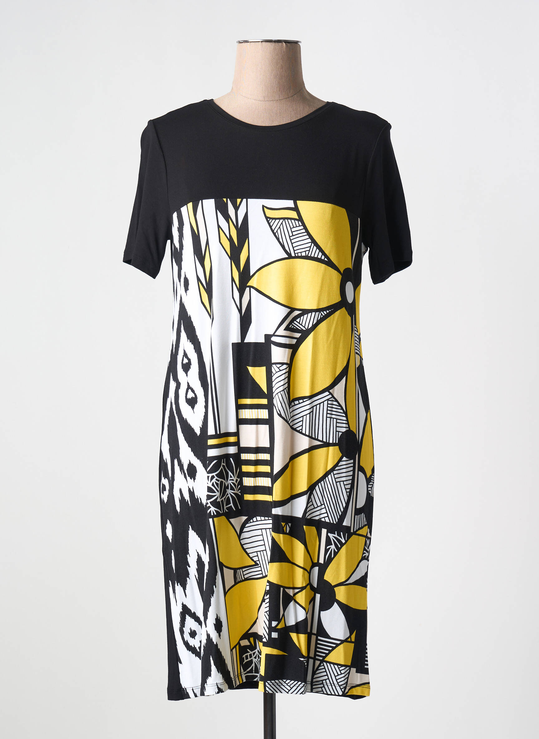 Profitez d’un vrai bon plan mode avec cette robe courte MASSANA pour femme, parfaite pour celles qui aiment conjuguer style et économies. Avec sa coupe droite et son jeu de motifs graphiques noirs et blancs rehaussés de larges fleurs jaunes, elle apporte une touche d’originalité à votre dressing tout en restant facile à porter au quotidien. Son encolure ronde et ses manches courtes lui assurent un confort idéal, tandis que son design moderne permet de la porter aussi bien pour une sortie en ville qu’au bureau, à petit prix.