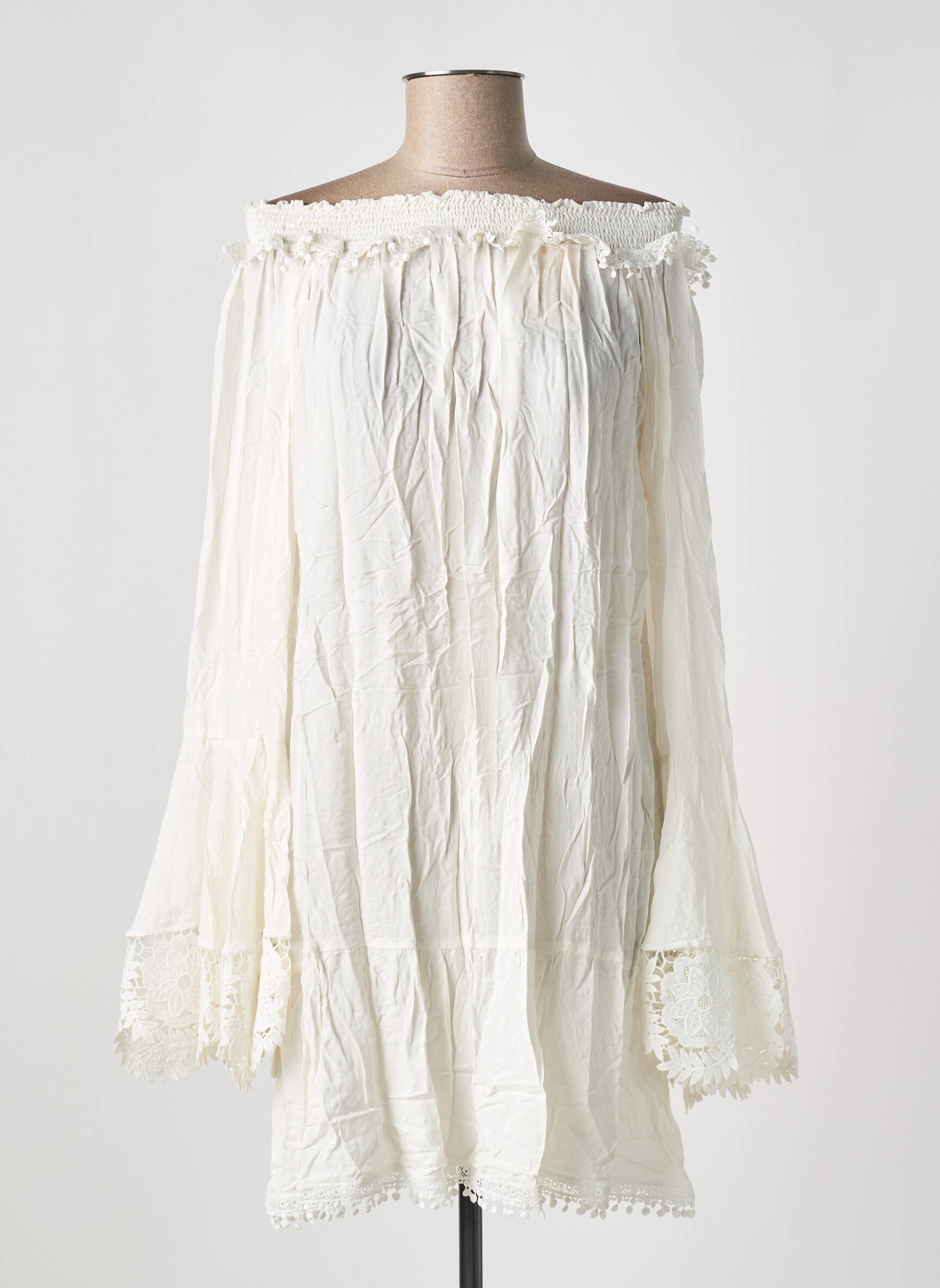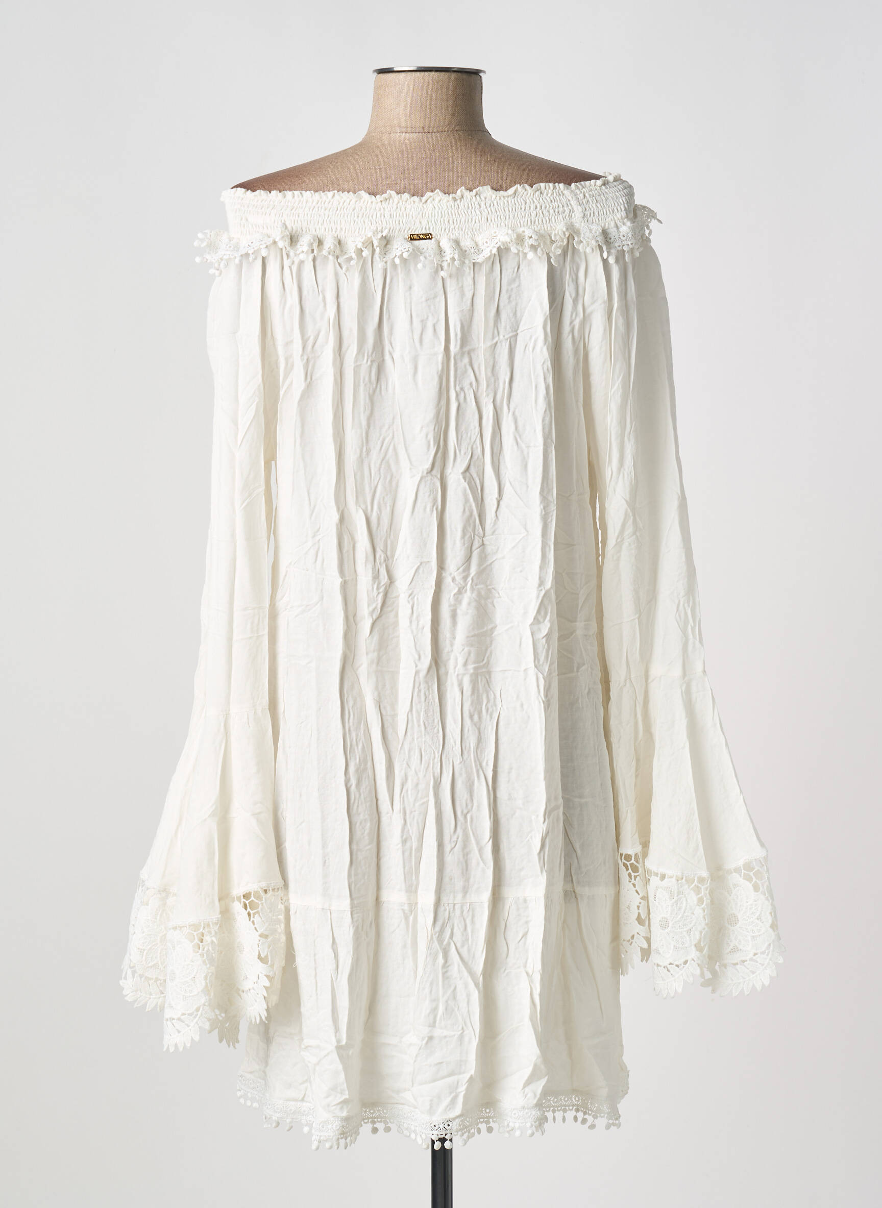 Comme une brise d'été capturée dans un tissu, cette robe courte MILONGA révèle une élégance naturelle et bohème avec son décolleté bardot délicatement orné de volants dentelés, tandis que ses manches longues légèrement évasées terminées par des poignets en dentelle ajoutent une touche romantique et féminine à l’ensemble fluide et légèrement froissé.