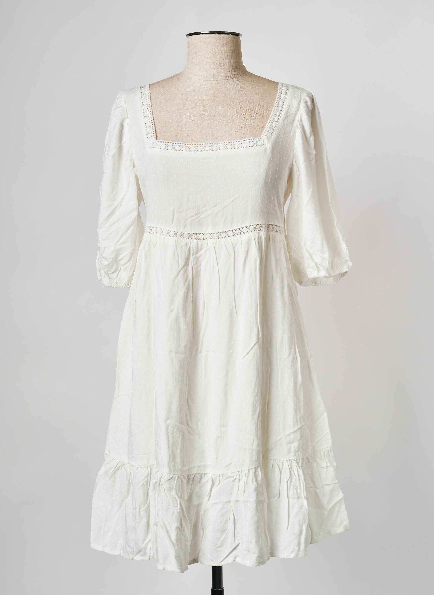 Imaginez une robe qui capture à la fois la douceur d'une journée d'été et l'élégance d'un charme intemporel avec cette création signée MOLLY BRACKEN. Cette robe courte pour femme séduit par sa coupe fluide et aérienne, sublimée par un décolleté carré délicatement orné d’une fine dentelle qui ajoute une touche romantique. Ses manches légèrement bouffantes s'arrêtent juste au-dessous du coude, apportant équilibre et féminité à la silhouette, tandis que la taille marquée souligne subtilement la finesse du corps. Ce vêtement blanc immaculé exprime une simplicité raffinée, idéale pour une allure naturelle et pleine de fraîcheur.