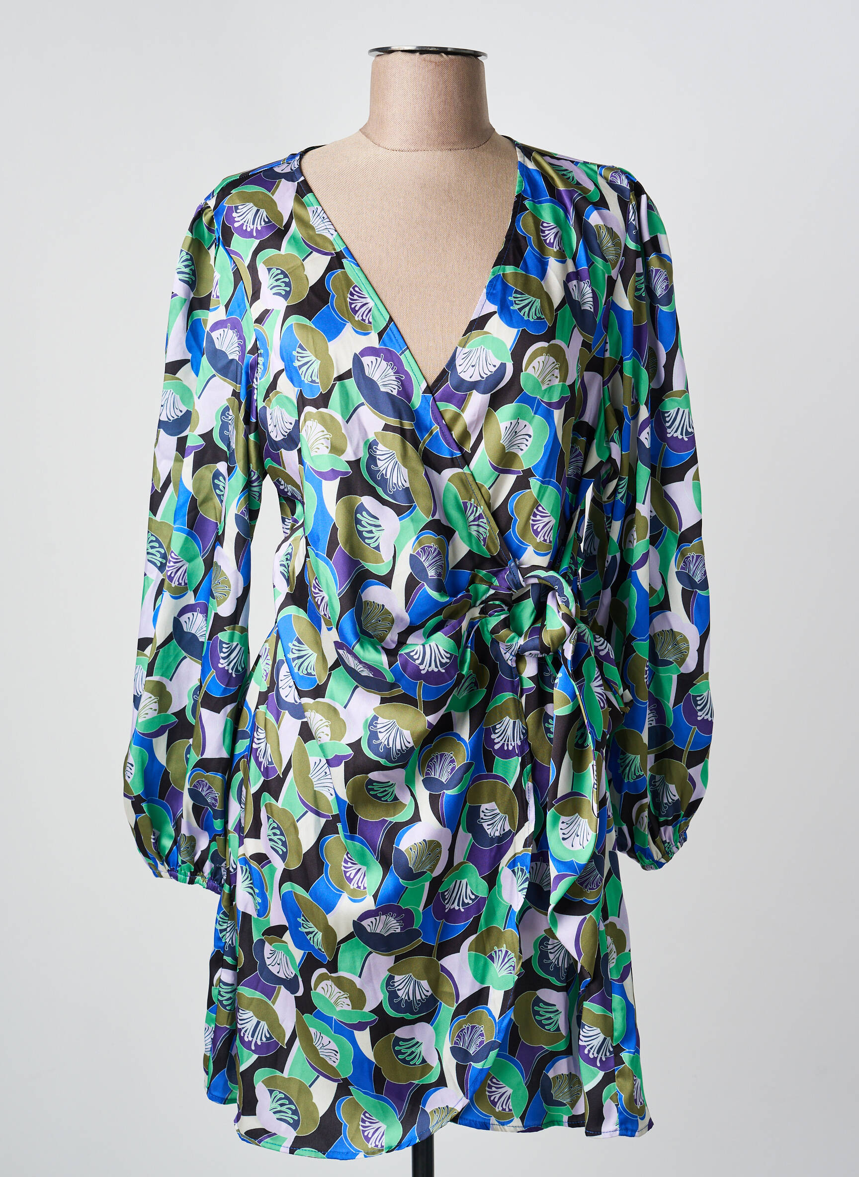 Craquez pour cette robe courte OGL à prix mini et offrez-vous une pièce tendance sans vous ruiner. Avec son imprimé original mêlant des nuances de bleu, vert et blanc sur un tissu fluide, elle présente une coupe portefeuille très flatteuse, un décolleté en V et un nœud élégant à la taille qui met en valeur la silhouette, tandis que les manches longues légèrement bouffantes ajoutent une touche chic et féminine idéale pour toutes les occasions.