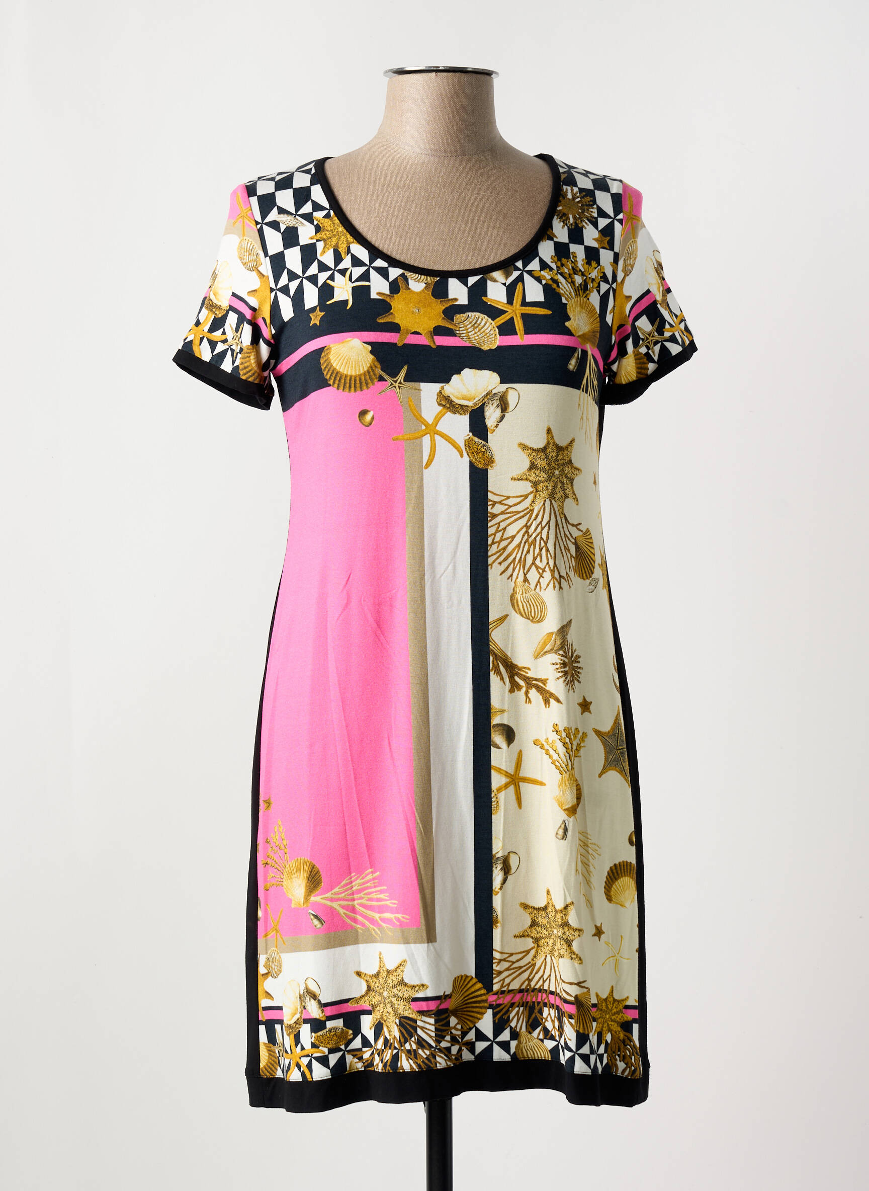 Craquez pour cette robe courte signée OLIVIER PHILIPS à petit prix, un véritable bon plan pour apporter une touche de chic à votre dressing sans vous ruiner. Son imprimé audacieux mêle harmonieusement des tons de rose, de blanc cassé et de noir rehaussés de motifs dorés, offrant à cette pièce un style unique et raffiné idéal pour se démarquer en toutes occasions. Profitez de cette exclusivité à prix doux pour allier élégance et économies !