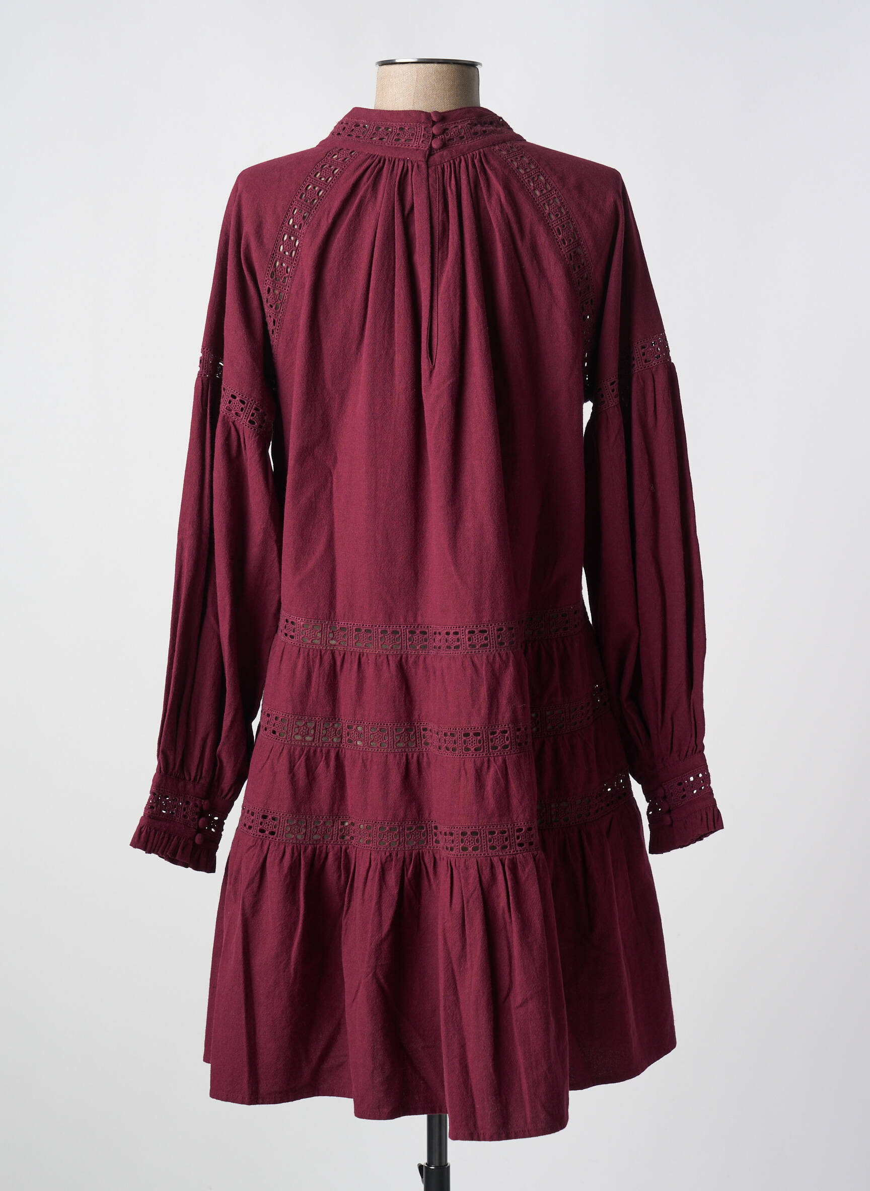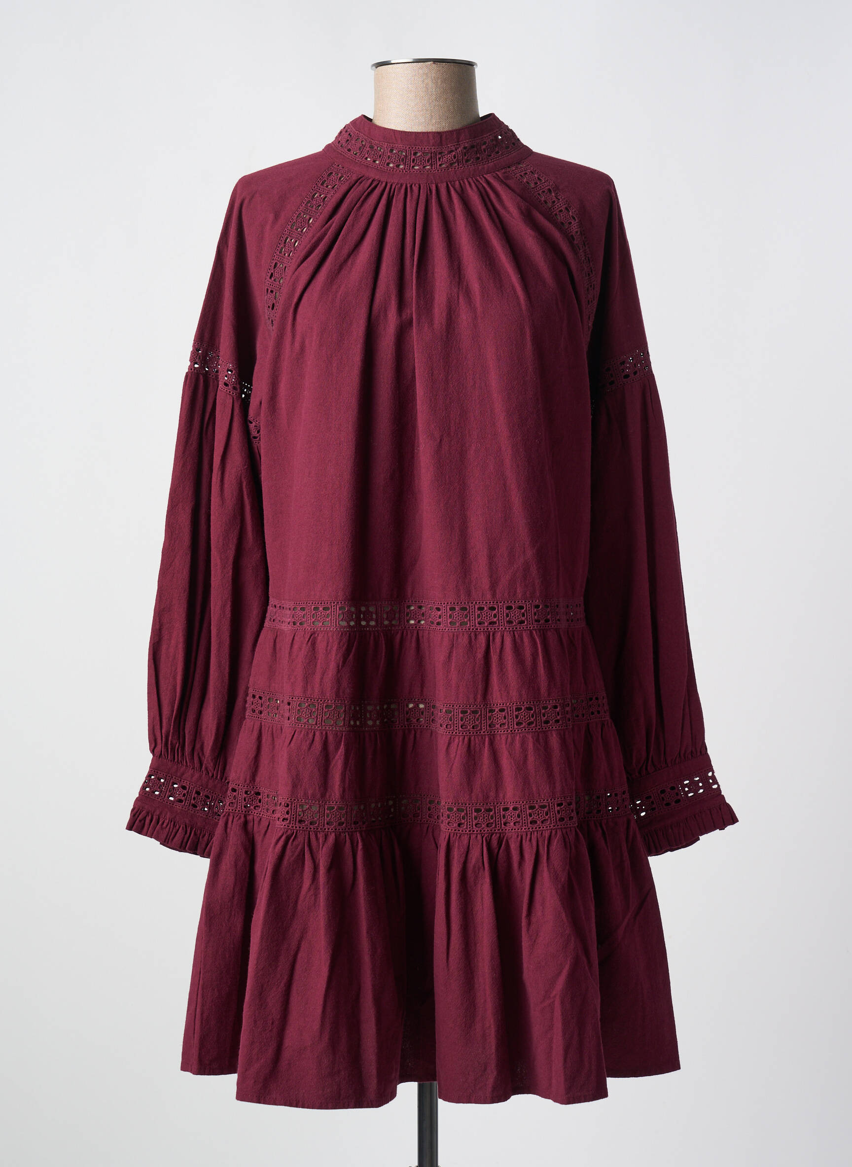 Imaginez une robe qui semble tout droit sortie d’un conte moderne, où élégance et confort s’entrelacent avec grâce ; cette création de PETITE MENDIGOTE en bordeaux profond séduit par son encolure montante délicatement ornée de petits détails ajourés, ses manches longues légèrement bouffantes qui apportent une touche de romantisme, et sa silhouette fluide rehaussée de volants et de bandes ajourées qui filent subtilement le regard vers une coupe courte pleine de charme.