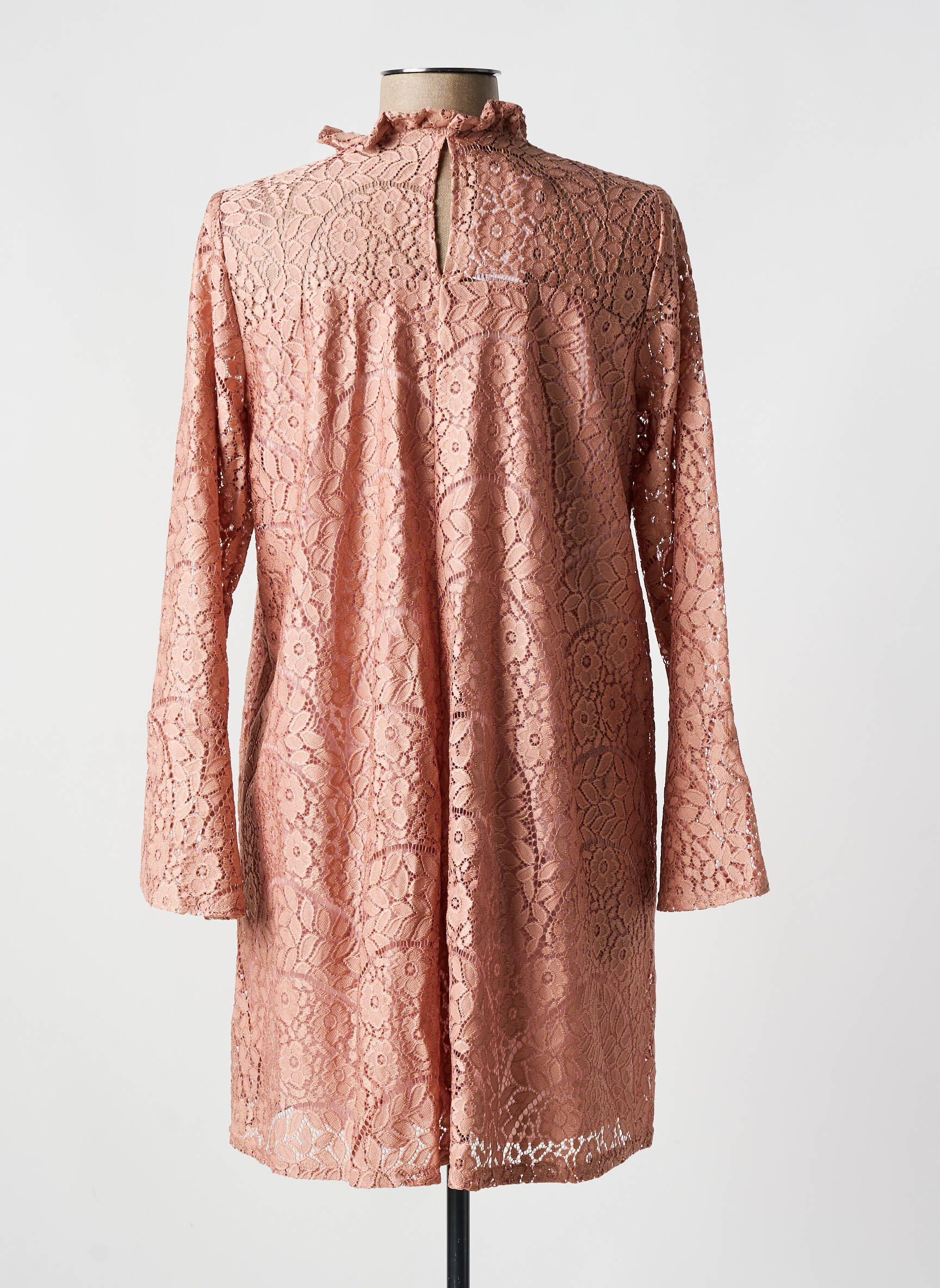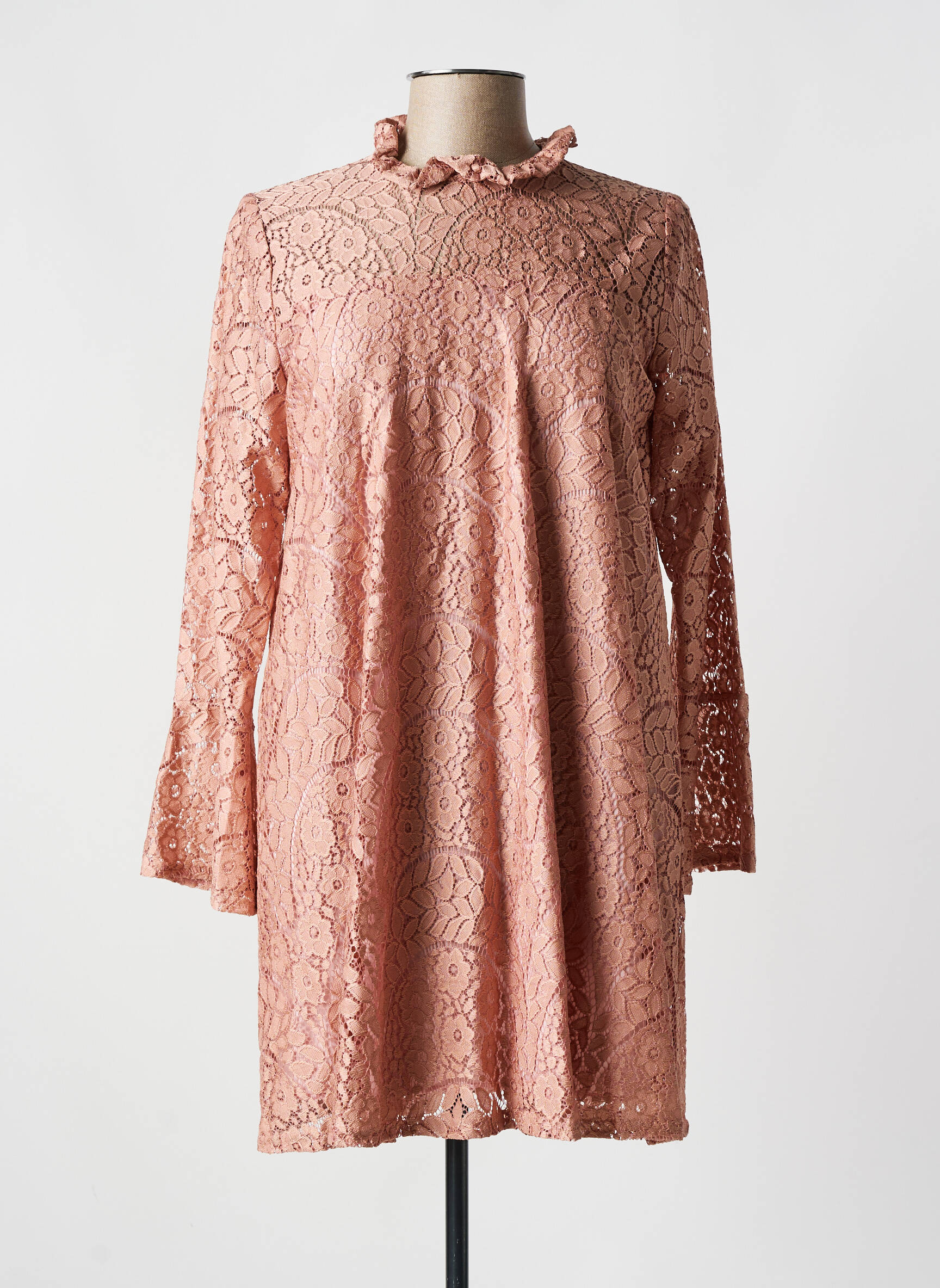 Imaginez une robe qui fusionne délicatesse et modernité avec une aisance déconcertante, telle est cette création de ROMEO POUR JULIETTE : une robe courte tout en dentelle rose poudré qui enveloppe la silhouette d’un jeu subtil de transparences, sublimée par un col volanté qui ajoute une touche romantique et un esprit légèrement rétro, tandis que ses manches longues et évasées apportent une élégance fluide et aérienne, parfaite pour une allure à la fois sophistiquée et féminine.