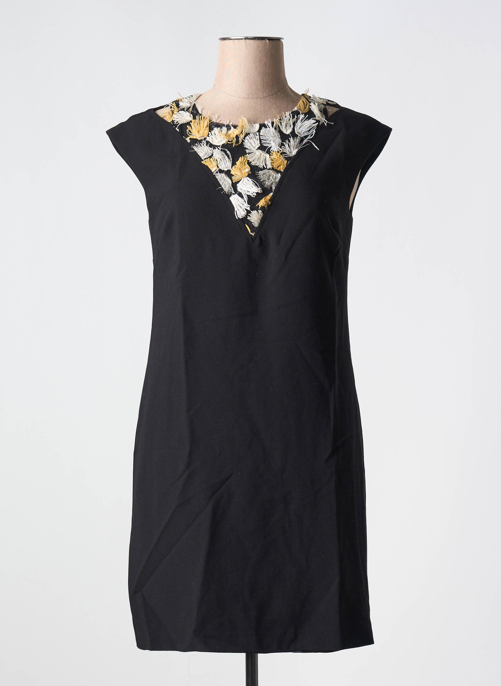 Profitez d’un excellent bon plan avec cette robe courte SINEQUANONE pour femme, une pièce élégante à prix mini qui se distingue par son col orné de broderies florales dans des tons dorés et blancs, contrastant joliment avec la simplicité et la sobriété de son tissu noir pour un look chic et raffiné sans vous ruiner.