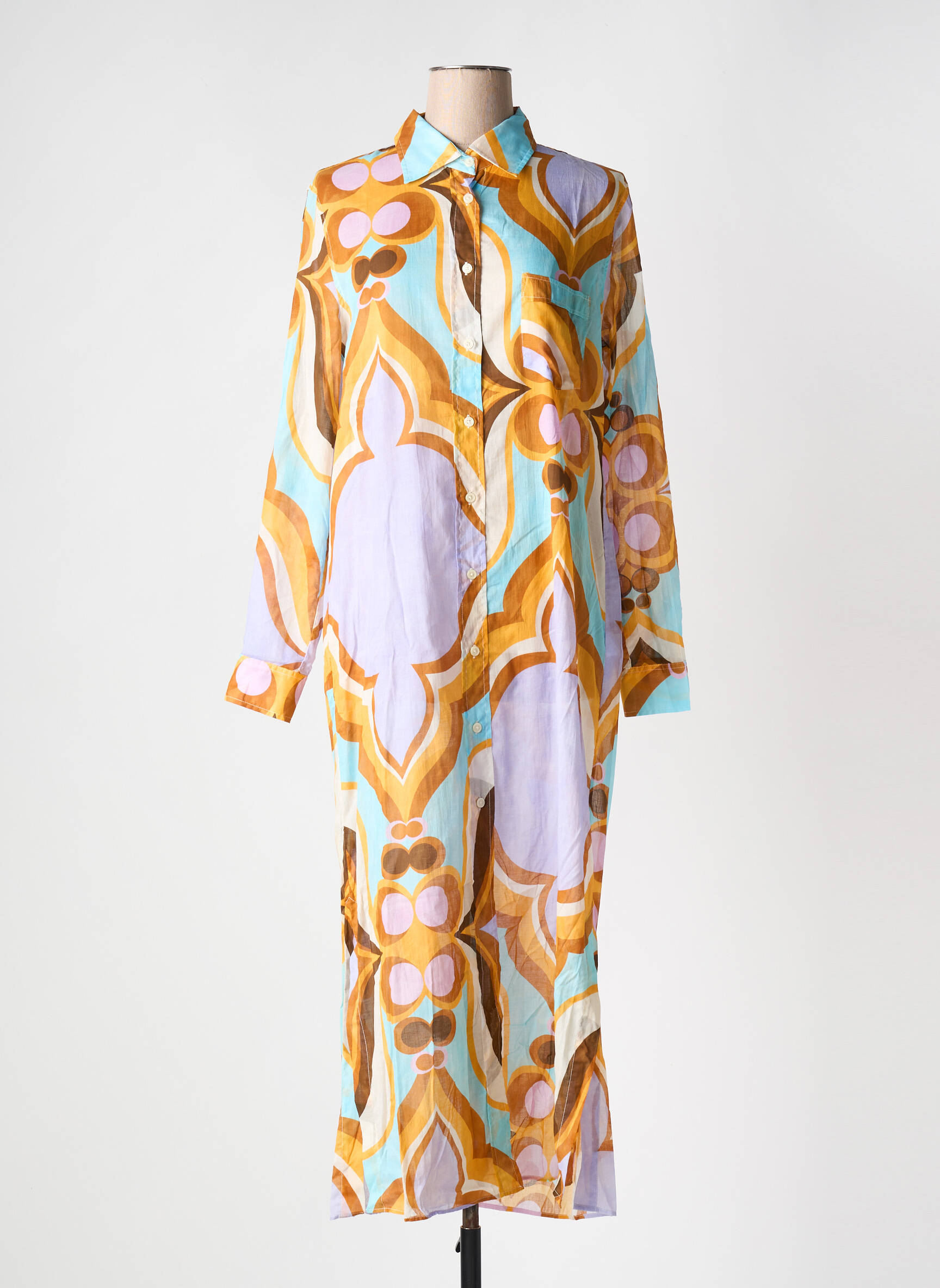 Craquez pour cette robe longue 0039 ITALY à prix mini et ajoutez une touche de fantaisie à votre garde-robe avec son imprimé graphique coloré, ses teintes pastel mélangées à des notes de marron doré, et sa coupe chemise facile à porter au quotidien pour un look tendance sans se ruiner.