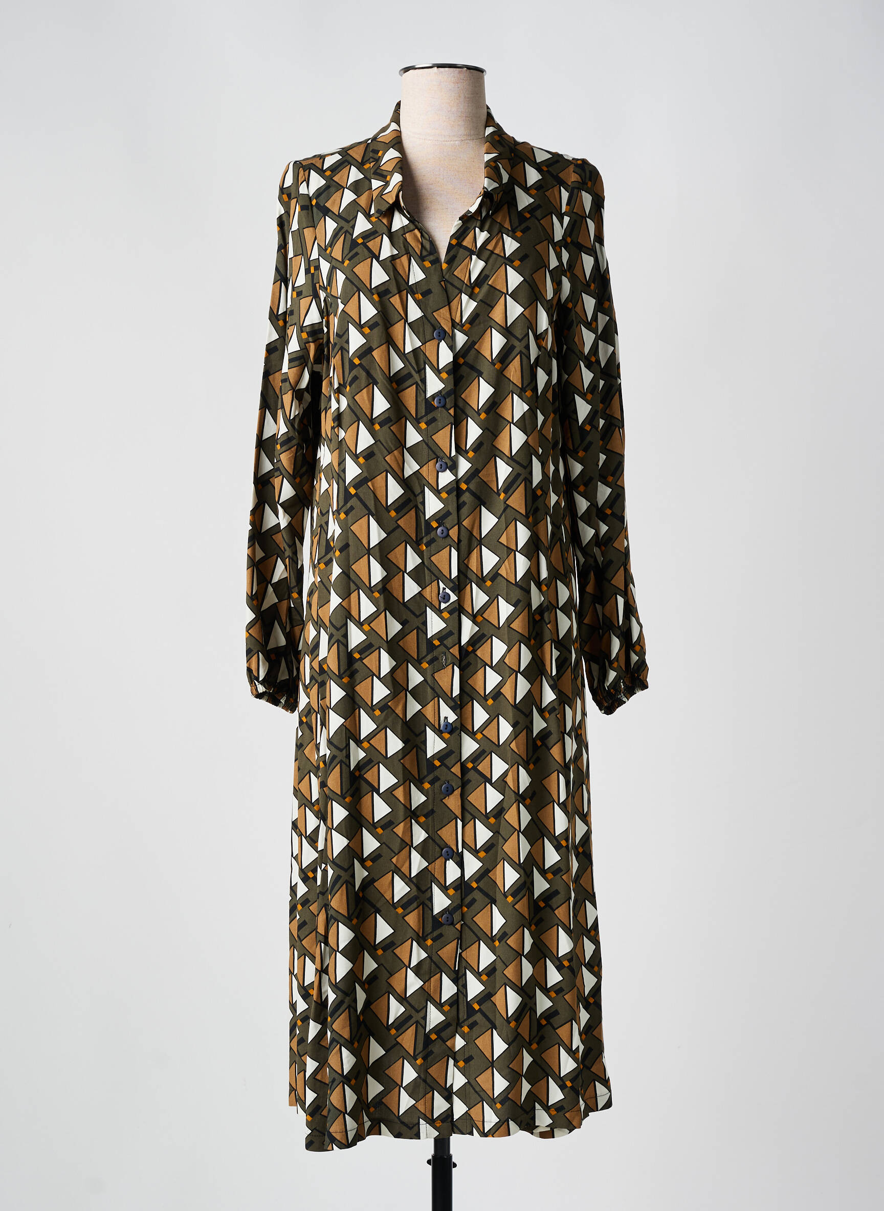 Comme une balade hypnotique au cœur d'un motif graphique, cette robe longue de la marque AN II VITO pour femme dévoile une silhouette fluide soulignée d'un col chemise classique et d’un boutonniage délicat sur le devant. Son imprimé triangulaire aux nuances chaudes de kaki, beige et noir apporte une ambiance rétro chic tout en restant moderne, tandis que ses manches longues légèrement bouffantes viennent apporter une touche d’élégance et de confort, faisant de cette pièce un allié parfait pour un look à la fois sophistiqué et décontracté.