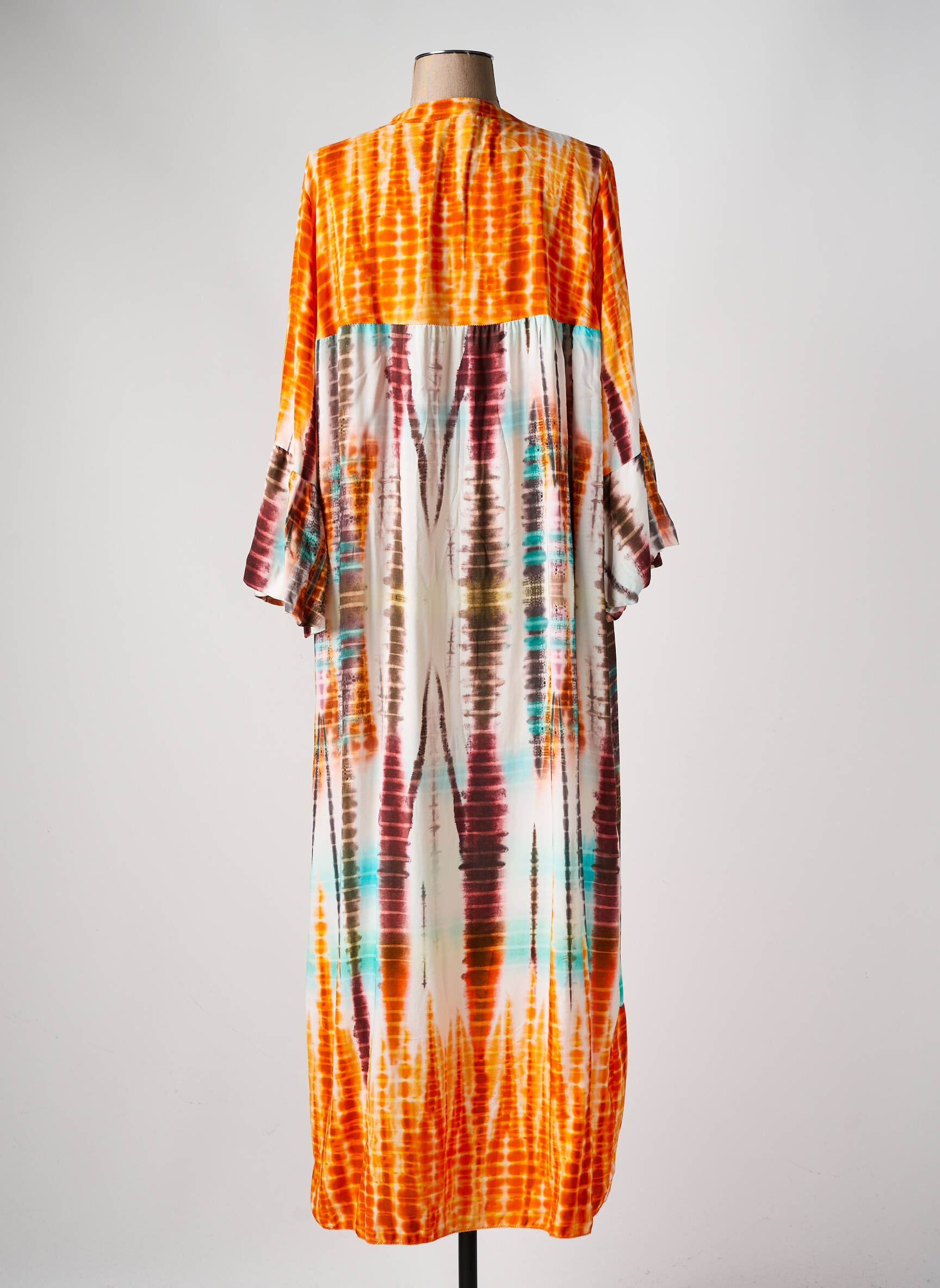 Profitez d’un bon plan irrésistible avec cette robe longue signée APRIL VINTAGE, parfaite pour ajouter une touche bohème à votre dressing sans faire exploser votre budget. Son motif tie and dye aux nuances orangées et turquoise apporte une note estivale et dynamique, tandis que sa coupe ample et ses manches évasées assurent une allure confortable et décontractée. La finition à encolure échancrée ornée de petits liens à pompons complète ce modèle idéal pour les journées ensoleillées ou vos escapades en vacances, à prix mini.