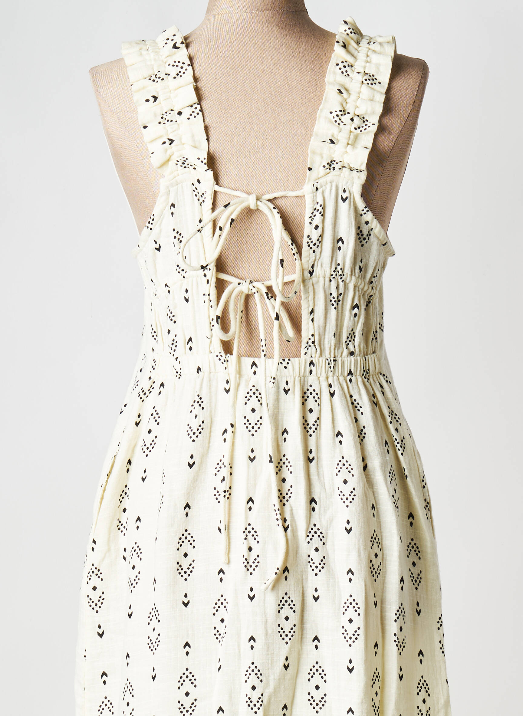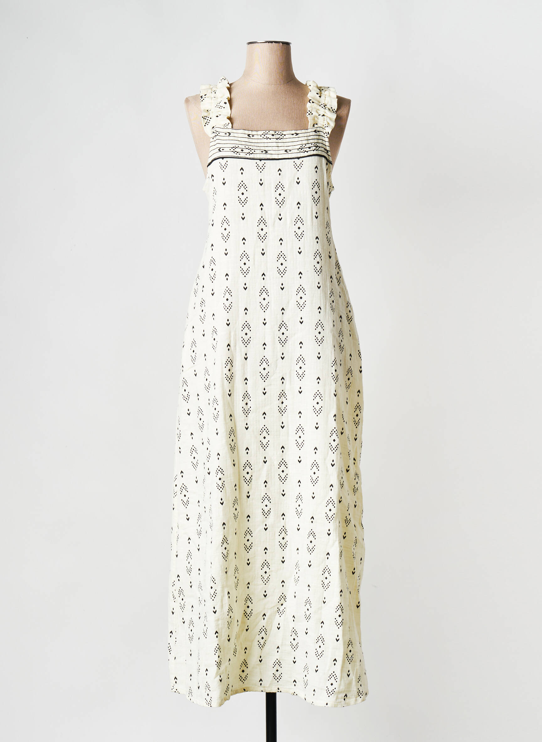 Profitez d’une robe longue B.YOUNG à prix mini pour rafraîchir votre dressing sans vous ruiner. Cette pièce fluide au motif graphique noir sur fond écru séduit par sa coupe élégante et décontractée ainsi que ses larges bretelles ornées de volants, parfaites pour sublimer vos journées d’été tout en faisant des économies sur un article tendance.