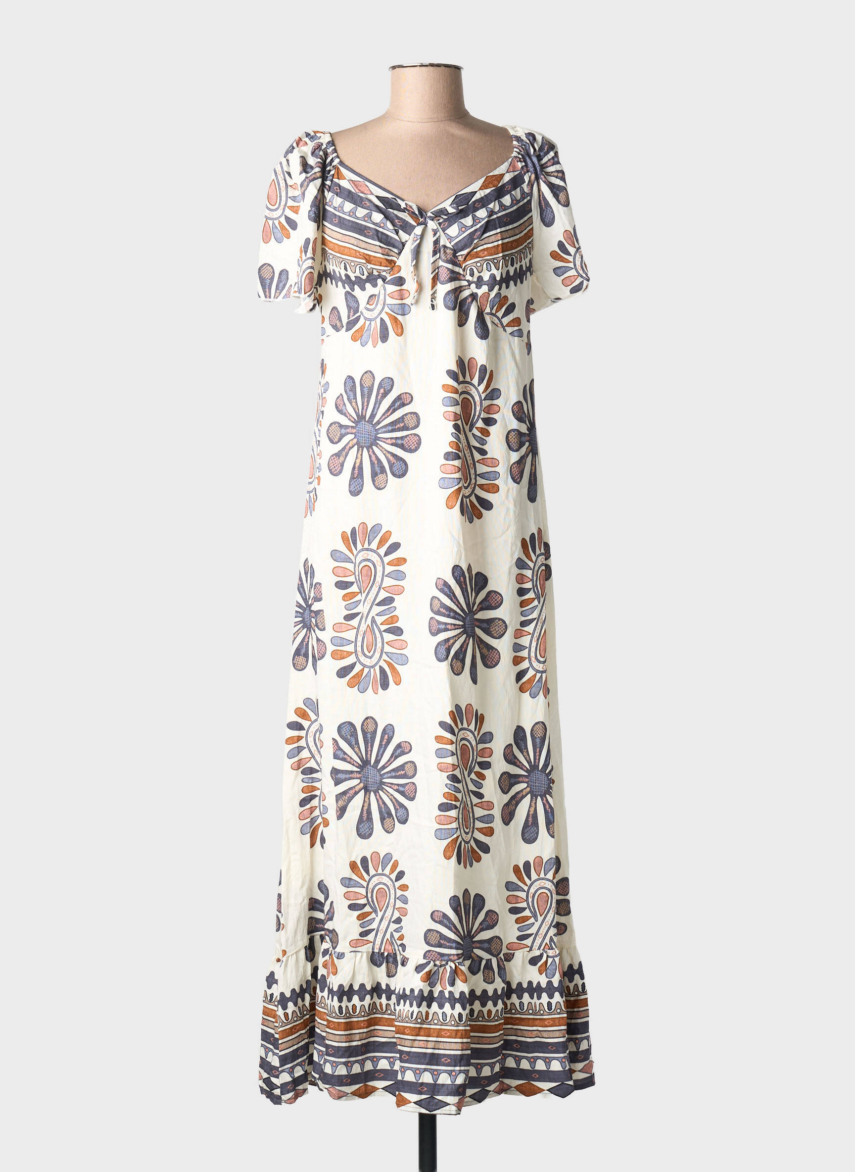 Profitez d’un véritable bon plan avec cette robe longue C'FLO pour femme, idéale pour adopter un style à la fois tendance et décontracté sans vous ruiner. Son motif floral ethnique sur fond clair apporte une touche de fraîcheur et d’originalité, tandis que sa coupe ample et son encolure féminine vous assurent confort et légèreté toute la journée. Une pièce à petit prix parfaite pour celles qui aiment allier élégance et économie.