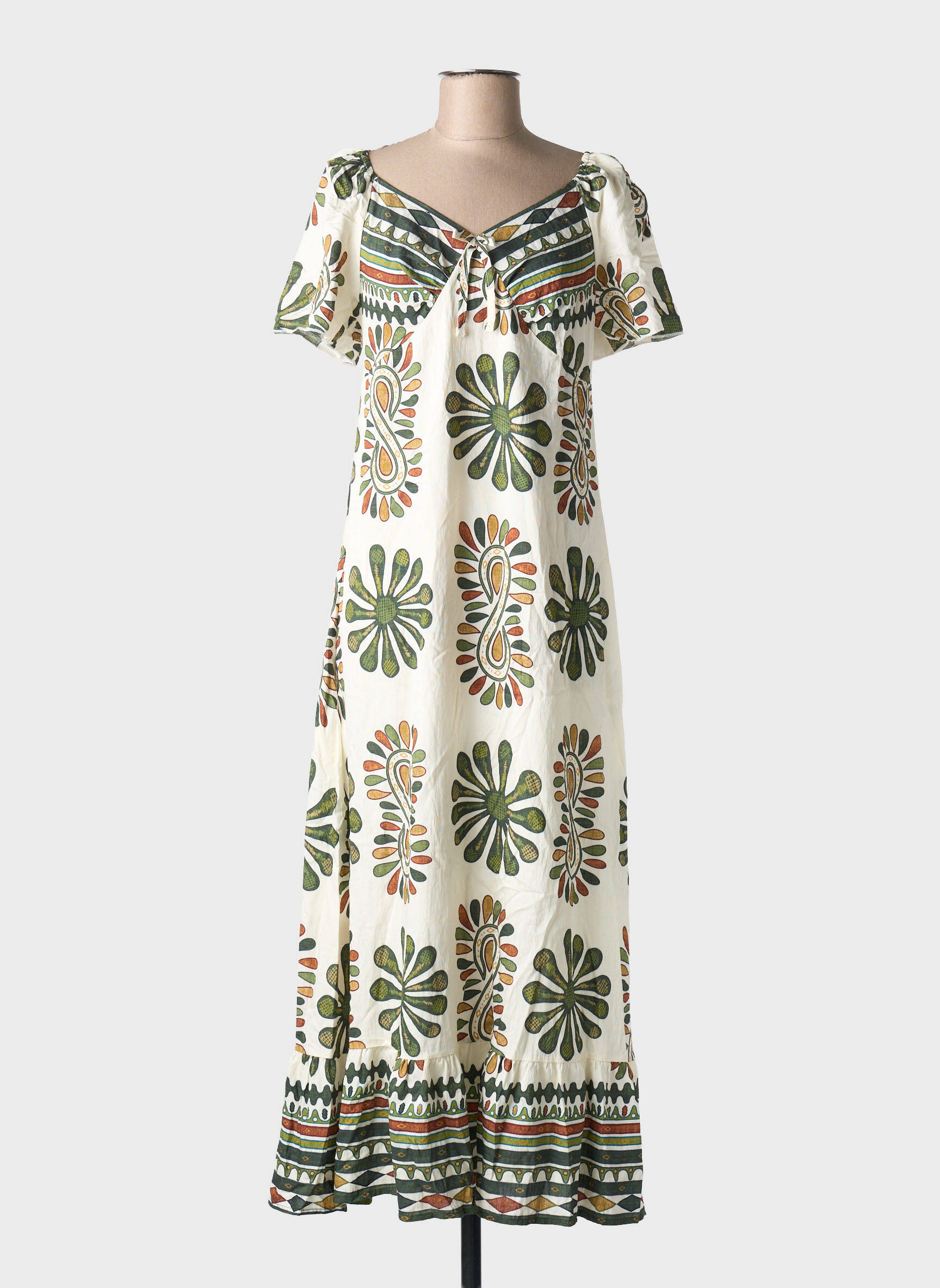 Profitez d’un véritable bon plan avec cette robe longue pour femme signée C'FLO, à petit prix pour un look tendance sans compromis. Son imprimé floral aux accents ethniques et ses nuances naturelles de vert et d’orange sur fond écru apportent une touche de fraîcheur et d’originalité à votre tenue, tandis que sa coupe fluide et son col élégant en V se prêtent aussi bien à une journée décontractée qu’à une soirée estivale. C’est la pièce parfaite pour allier style et économies, et donner du caractère à votre dressing sans vous ruiner.