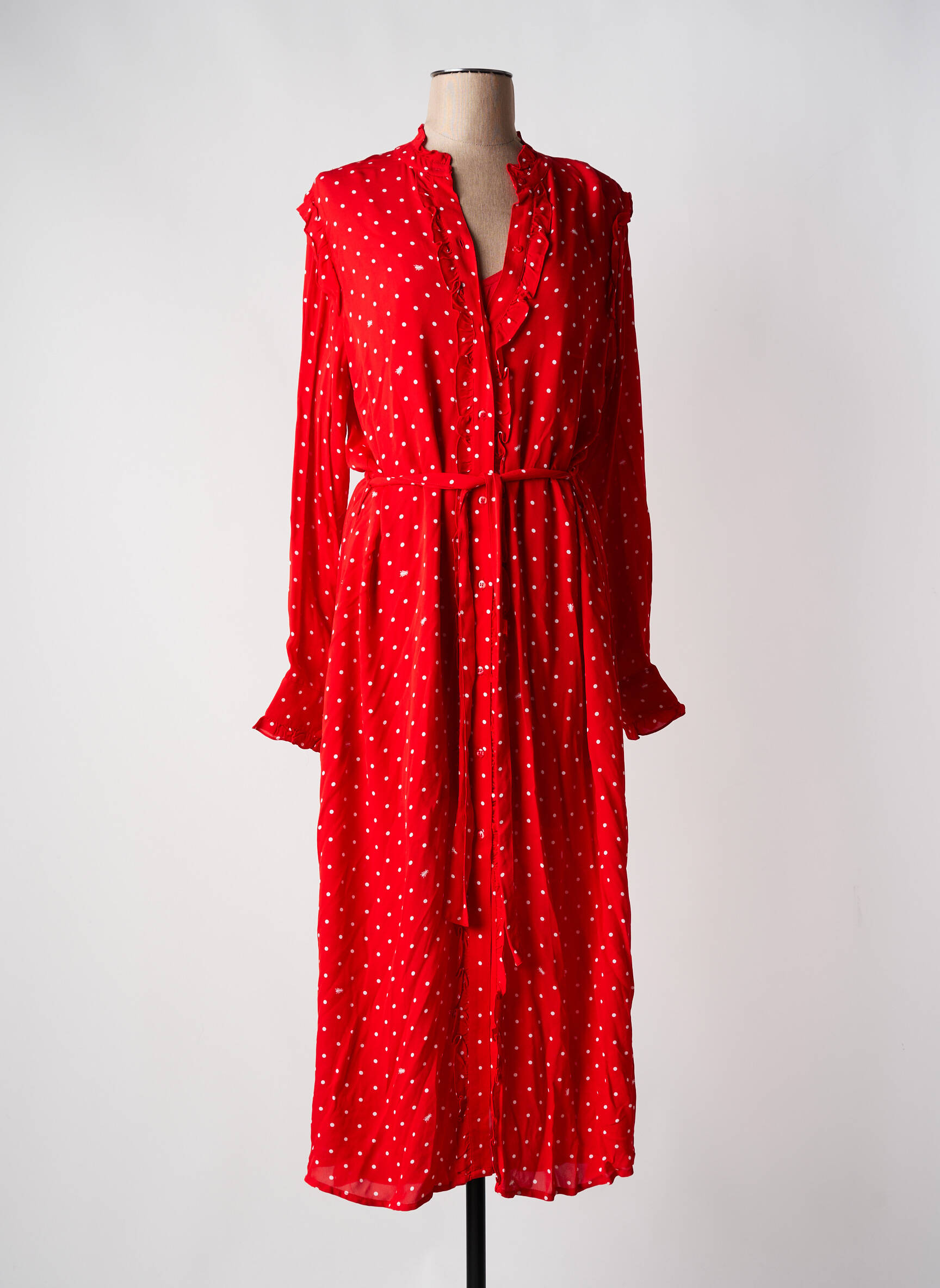 Craquez pour cette superbe robe longue ESSENTIEL ANTWERP à prix tout doux, idéale pour apporter une touche de fraîcheur et d’élégance à votre garde-robe sans vous ruiner. Sa coupe fluide met en valeur la silhouette tandis que le tissu éclatant rouge à pois blancs apporte une note joyeuse et rétro, parfaite en toutes occasions. Le col travaillé, les manches longues et la ceinture à nouer soulignent le style raffiné et féminin de ce modèle incontournable, un vrai bon plan à saisir pour relooker votre dressing à petit prix.