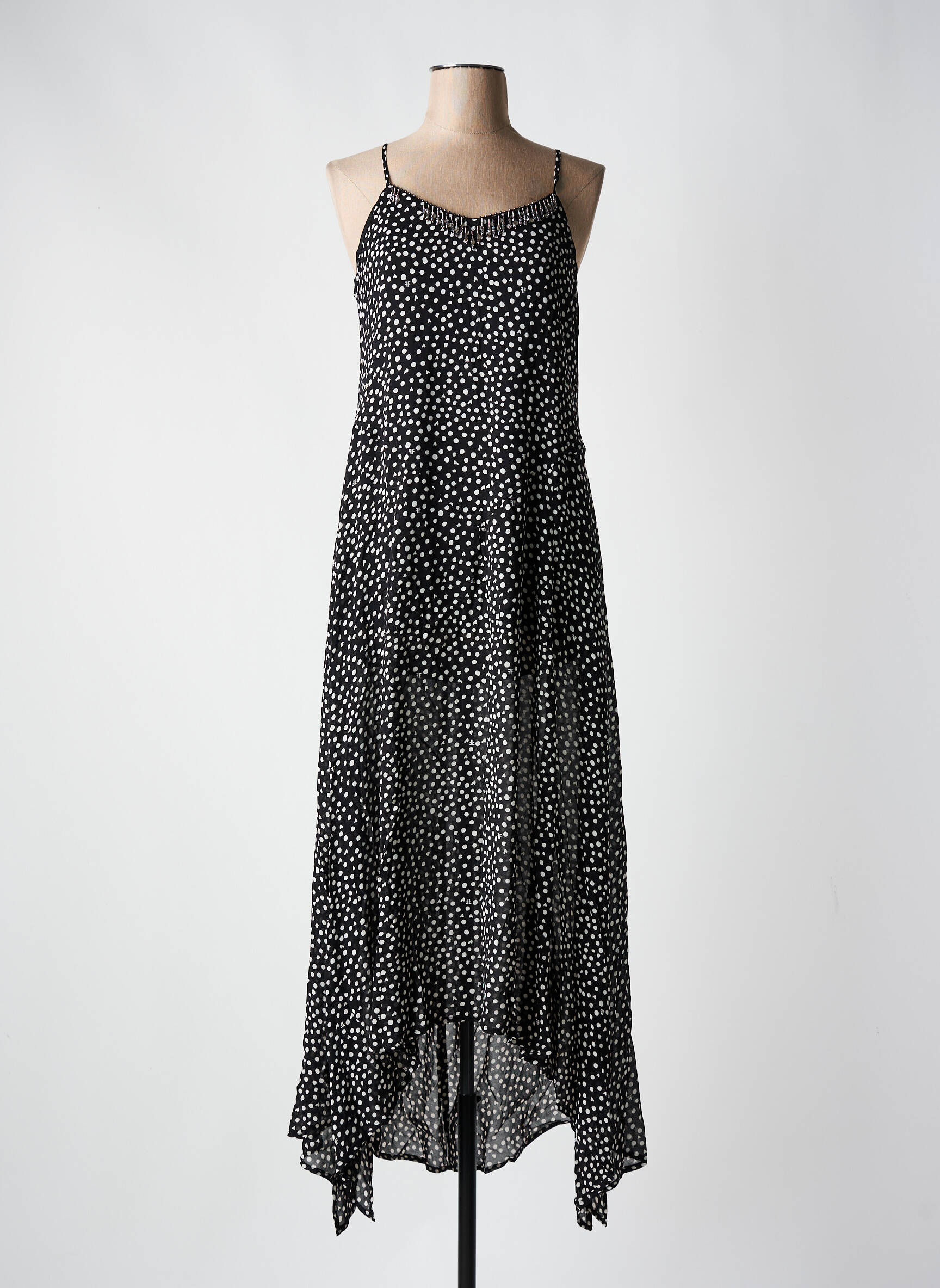 Profitez d’un bon plan irrésistible avec cette robe longue FRACOMINA pour femme, idéale pour sublimer votre garde-robe à petit prix. Sa coupe fluide met en valeur la silhouette tandis que ses fines bretelles et son joli imprimé à pois noirs et blancs apportent une touche élégante et féminine, parfaite aussi bien pour le quotidien que pour une soirée habillée. La finition asymétrique du bas vient accentuer le mouvement du tissu pour un tombé moderne et sophistiqué, le tout à un prix mini sans compromis sur le style.