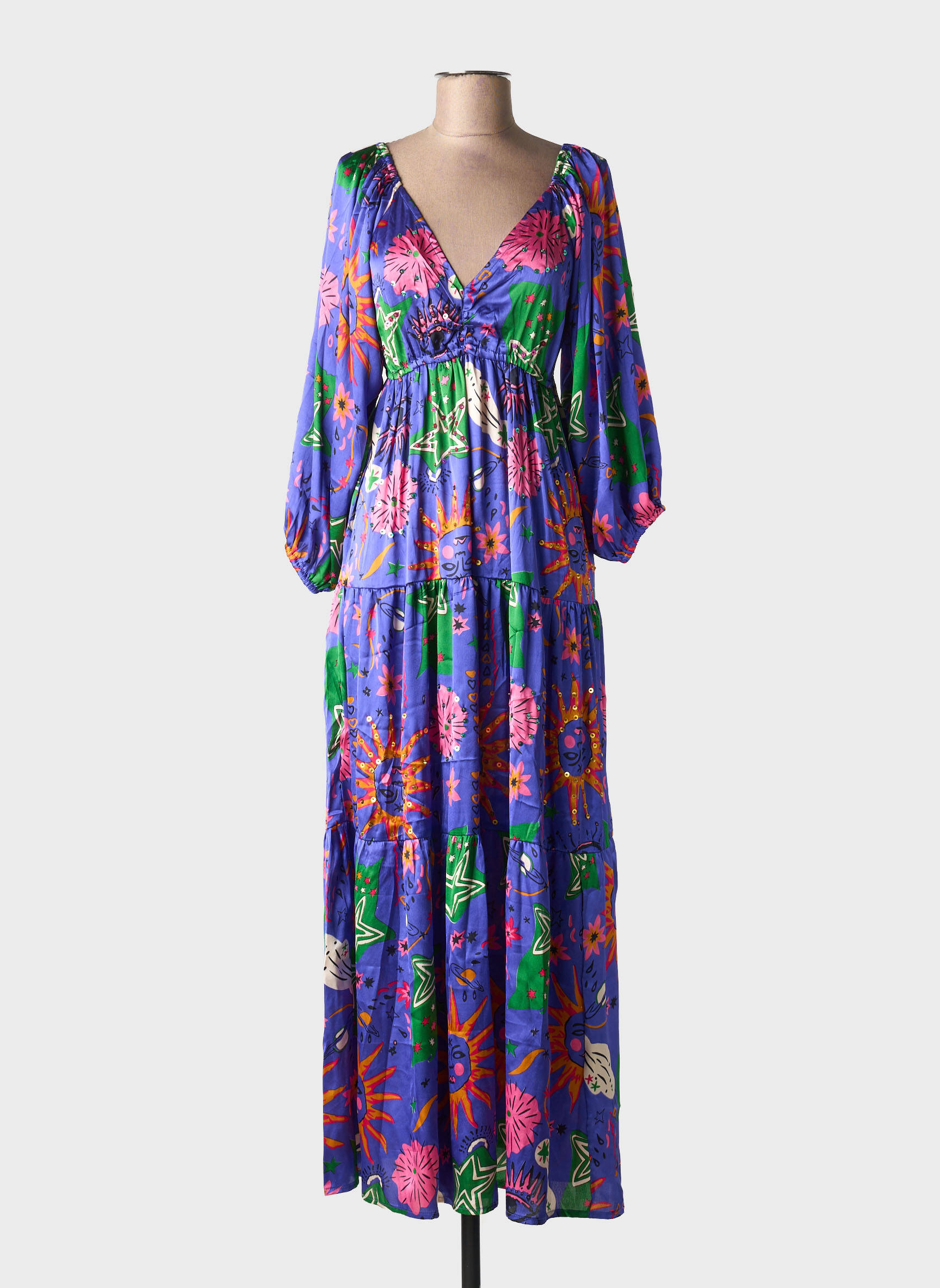 Craquez pour cette robe longue GOLD&SILVER PARIS à prix mini, parfaite pour ajouter une touche de couleur et d’exotisme à votre dressing sans vous ruiner. Avec son imprimé floral éclatant sur fond violet, sa coupe fluide et son décolleté en V qui sublime la silhouette, elle offre un look bohème chic irrésistible, idéal autant pour la ville que pour les vacances. Adoptez-la pour un effet waouh à petit prix et profitez d’un bon plan mode qui fait vraiment la différence.