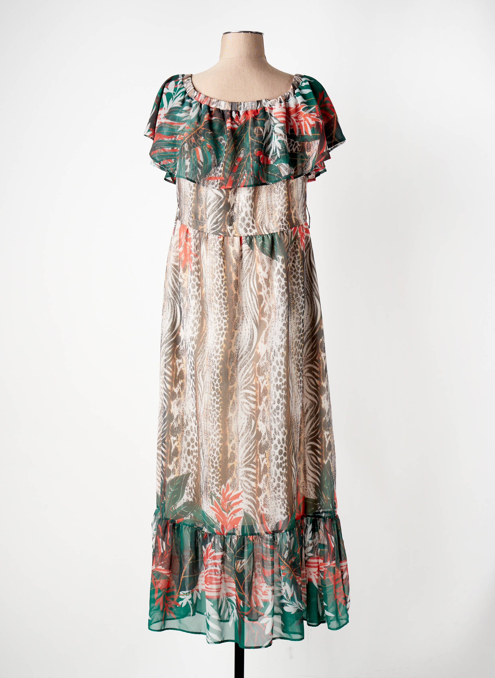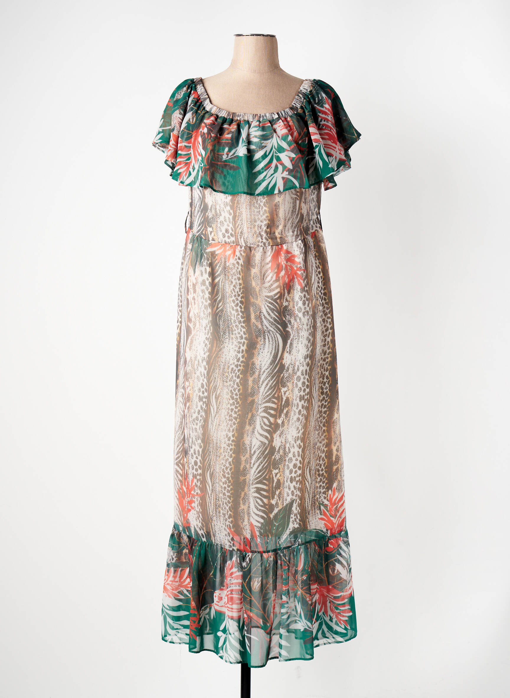 Profitez d'une vraie bonne affaire avec cette superbe robe longue de la marque GREGORY PAT, parfaite pour celles qui recherchent une pièce élégante à petit prix. Ce modèle séduit par son imprimé végétal aux nuances vertes et corail, ses volants légers sur le décolleté et à la base, et son joli tombé fluide qui met en valeur la silhouette tout en offrant un confort optimal. Idéale pour les journées d'été ou les soirées sous les tropiques, elle offre une allure féminine et raffinée à prix dégriffé.