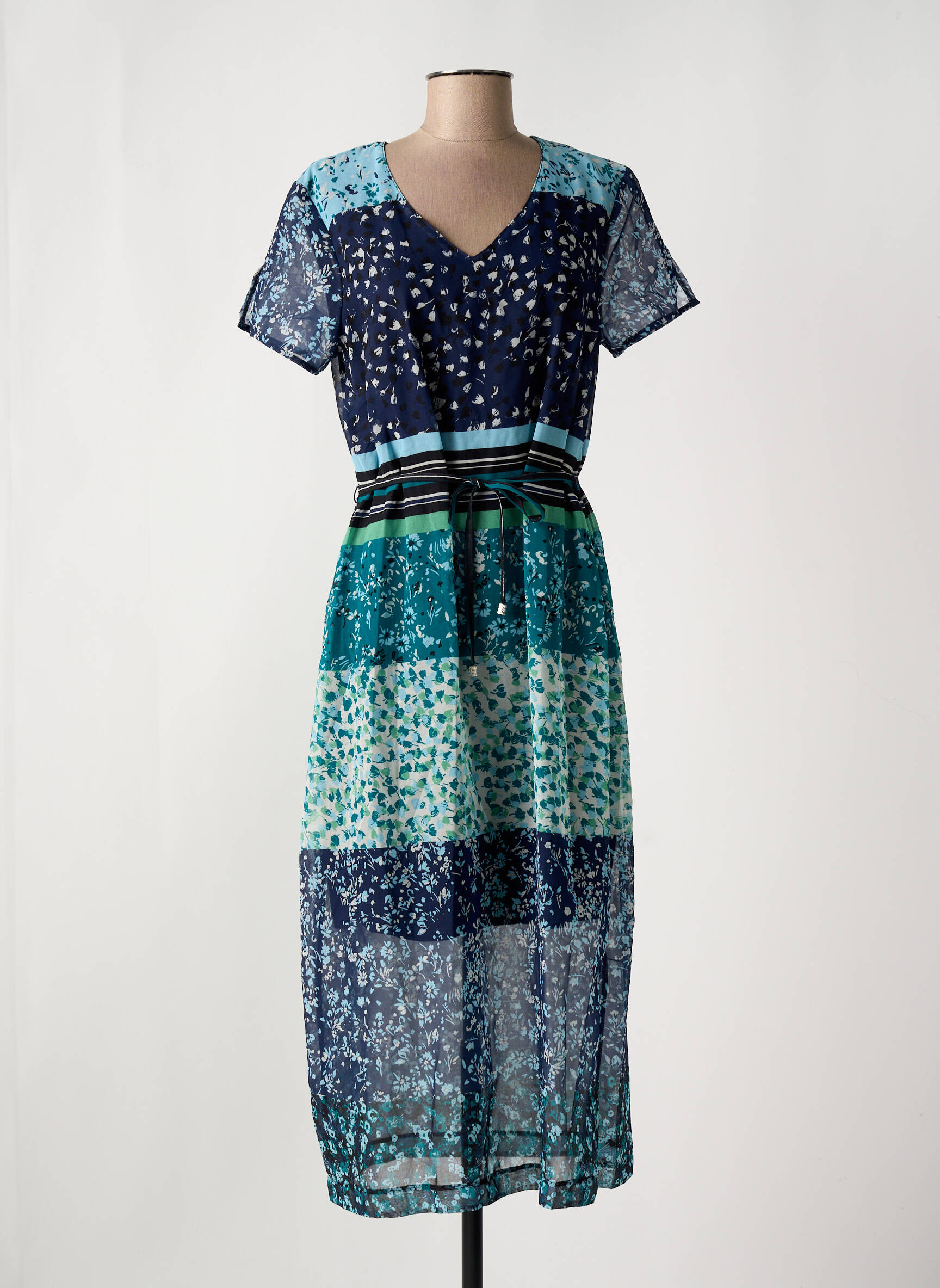 Profitez d’un véritable bon plan avec cette robe longue GRIFFON pour femme, idéale pour apporter une touche de fraîcheur et de modernité à votre garde-robe à petit prix. Sa coupe fluide et son imprimé à motifs graphiques mêlant des nuances de bleu et de vert offrent une allure féminine, tandis que le décolleté en V et la ceinture à la taille subliment la silhouette. Ce modèle allie légèreté et confort, parfait pour vos journées d’été ou une sortie décontractée, sans compromis sur le style ni sur votre budget.