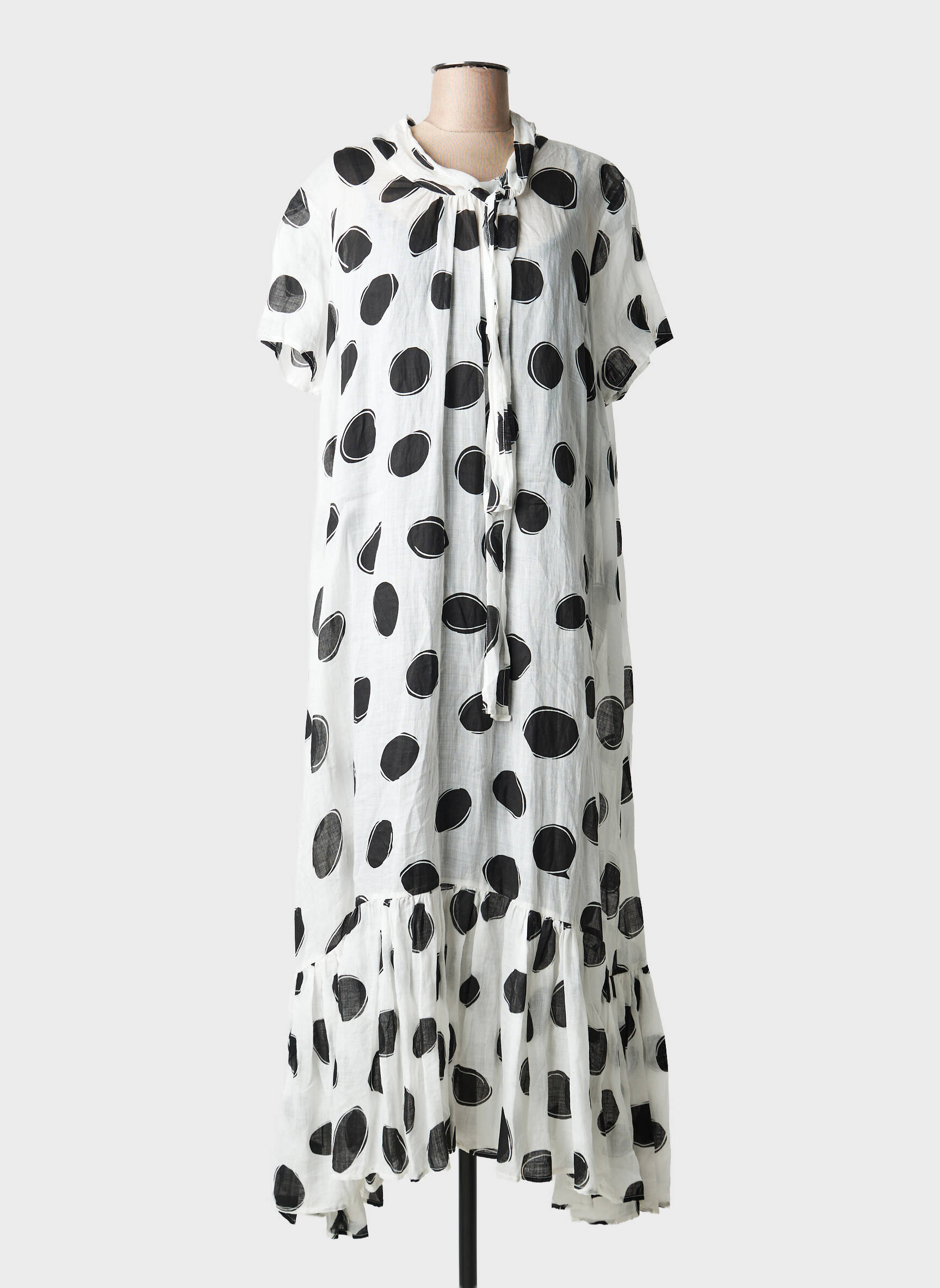 Craquez pour cette robe longue KEDZIOREK à prix mini, idéale pour ajouter une touche d’originalité à votre garde-robe sans vous ruiner. Son imprimé à gros pois noirs sur fond blanc lui donne un charme unique et moderne, tandis que sa coupe ample et fluide assure un confort parfait tout au long de la journée. Les détails de son col noué et son bas volanté apportent une note féminine et tendance, parfaite pour celles qui aiment associer style et petits prix.