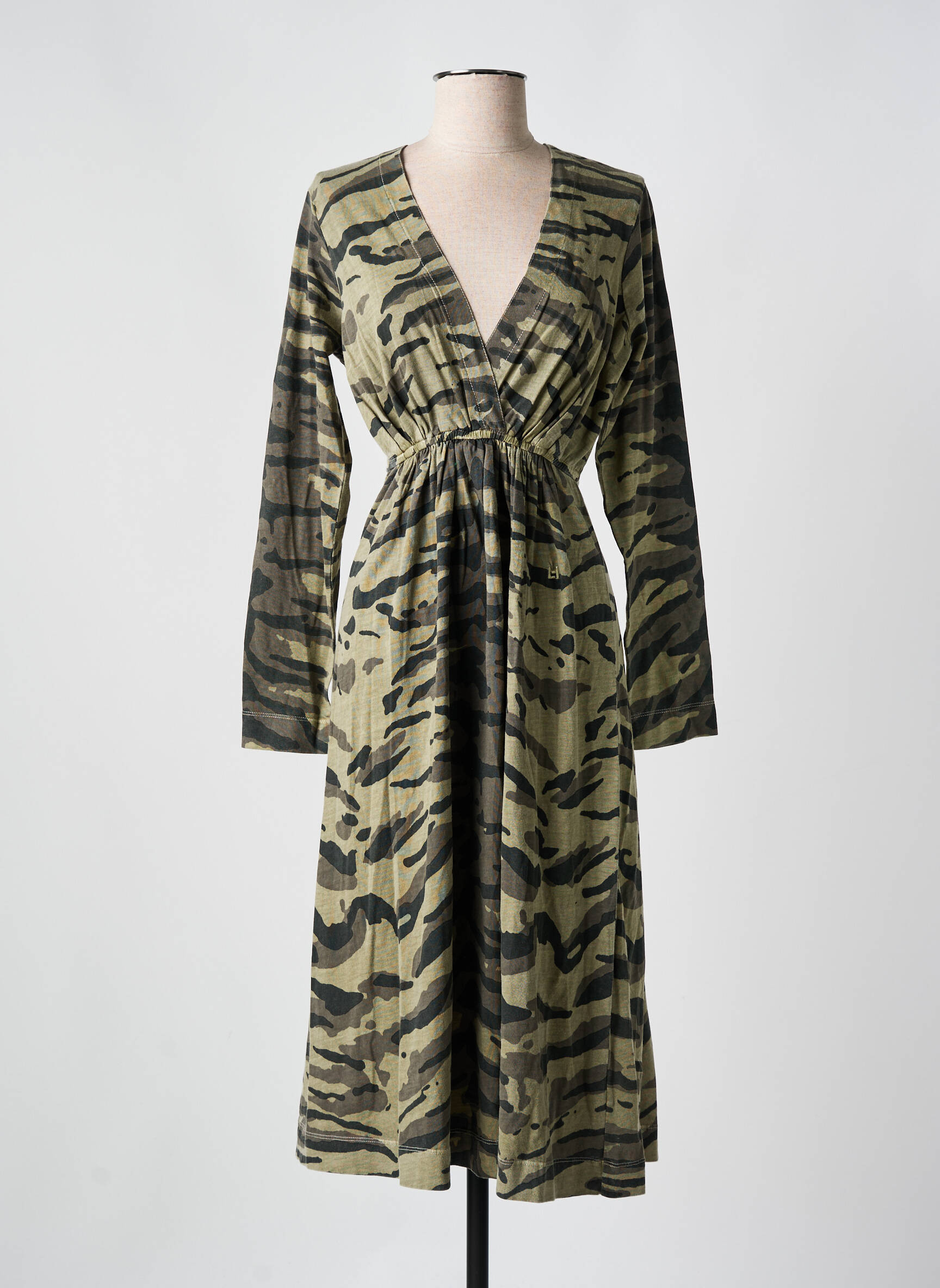 Plongez dans un style audacieux où la sophistication rencontre l'esprit libre avec cette robe longue de la marque LEON & HARPER. Arborant un motif camouflage tout en subtilité, elle se distingue par sa coupe fluide qui épouse délicatement la silhouette, soulignant la taille grâce à une ceinture intégrée. Les manches longues et le décolleté en V ajoutent une touche de féminité, parfait pour passer d'une journée décontractée à une soirée élégante. Ce vêtement devient un incontournable de votre garde-robe, alliant confort et allure dynamique.