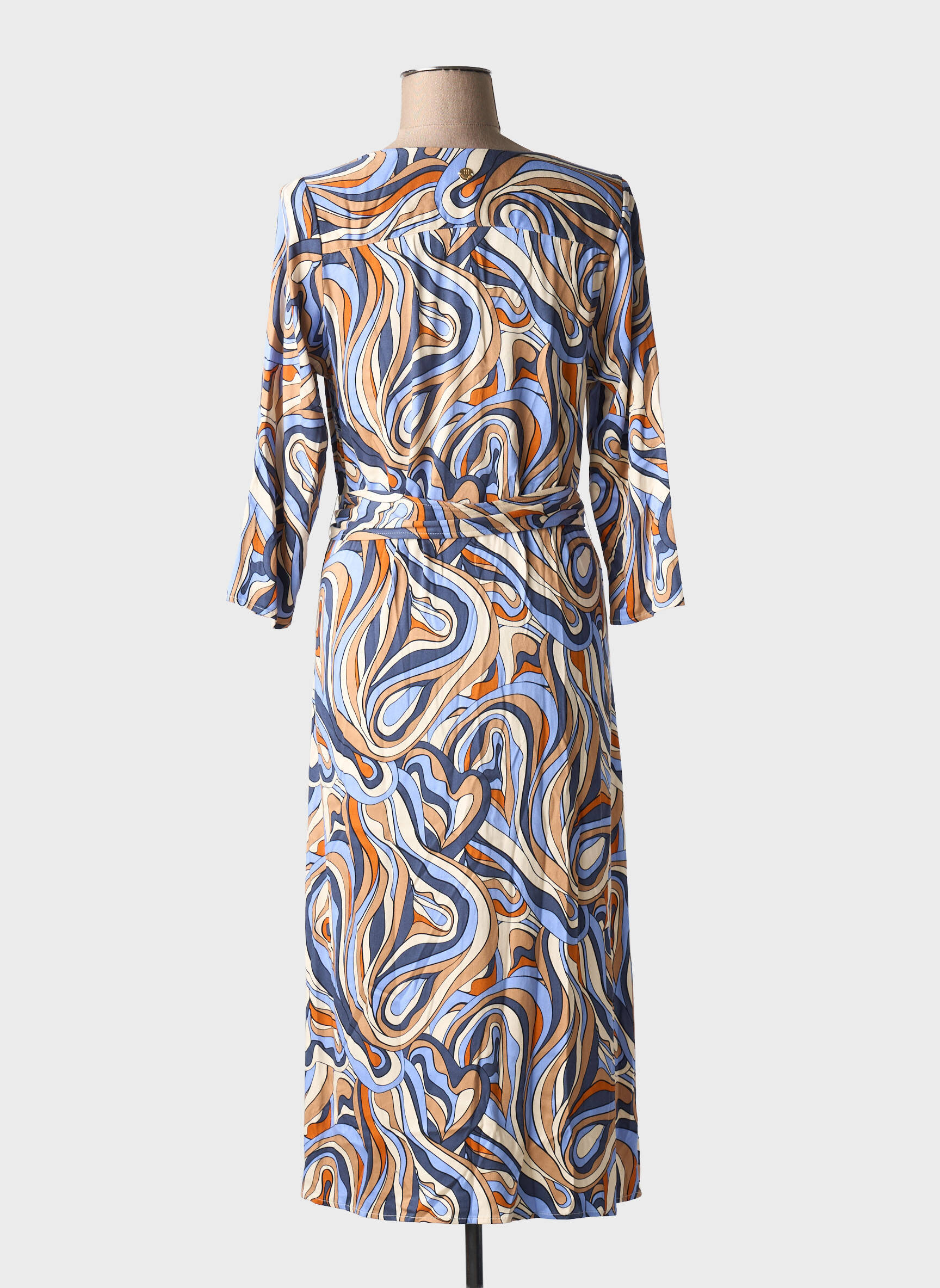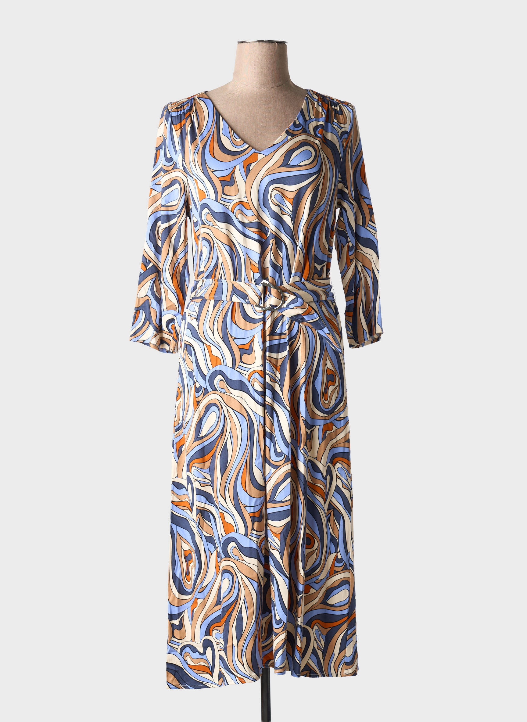 Profitez d’un vrai bon plan avec cette robe longue LOLA ESPELETA pour femme, parfaite pour allier élégance et confort sans se ruiner. Son imprimé aux motifs tourbillonnants dans les tons bleu, beige et orangé apporte une touche d’originalité et de fraîcheur à votre dressing, tout en restant facile à accessoiriser. Son col en V flatte la silhouette et sa ceinture à nouer souligne délicatement la taille, pour une allure féminine et moderne à prix mini. Idéale pour vos journées estivales ou vos soirées, cette robe vous permet de renouveler votre style à petit prix, tout en affirmant votre personnalité.