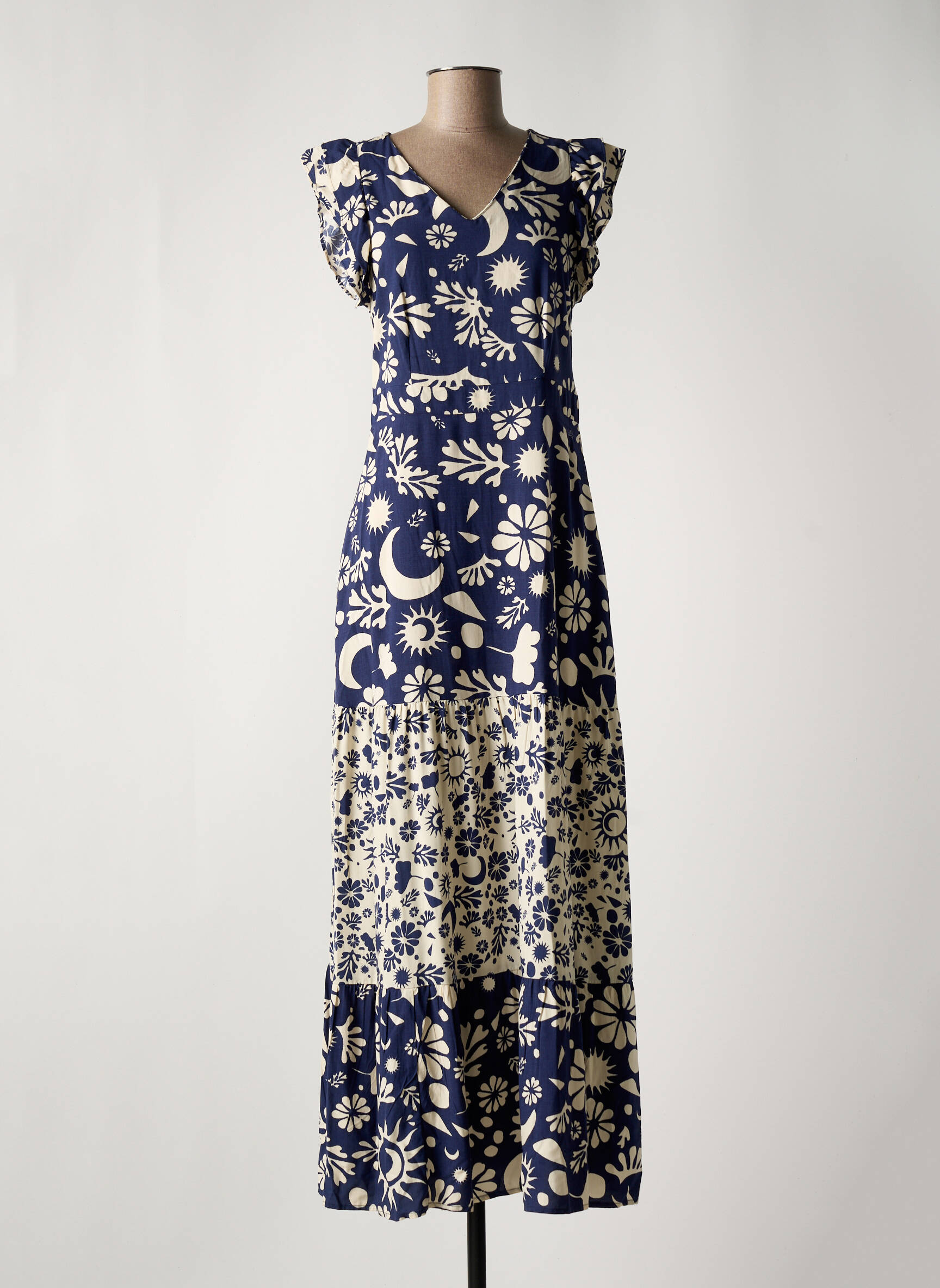 Craquez pour cette robe longue de la marque MD'M, une véritable opportunité à prix mini pour apporter une touche d’originalité à votre dressing sans vous ruiner. Son imprimé graphique mêle fleurs, soleils et lunes dans des tons bleu marine et beige pour un look à la fois bohème et moderne, tandis que sa coupe fluide et son encolure féminine mettent en valeur votre silhouette avec élégance. Profitez de cette pièce tendance à petit prix pour vous offrir une allure stylée tout en réalisant une belle économie.