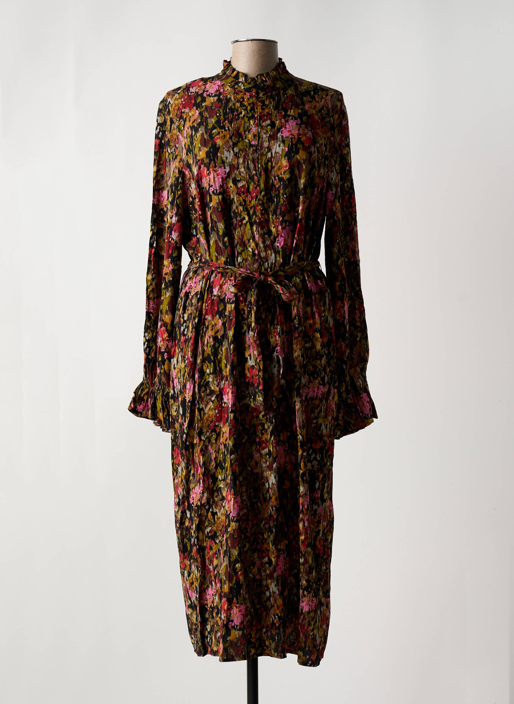 Imaginez une robe qui capture l’essence même d’un jardin secret au crépuscule : cette robe longue de la marque MINIMUM pour femme mêle une profusion de fleurs délicates aux teintes chaudes et profondes, jouant avec les nuances de kaki, rose et or. Son col montant et ses manches longues subtilement bouffantes apportent une élégance intemporelle tandis que la ceinture à nouer à la taille souligne la silhouette avec grâce, faisant de cette pièce un véritable poème vestimentaire parfait pour les journées où l’on souhaite allier confort et raffinement.