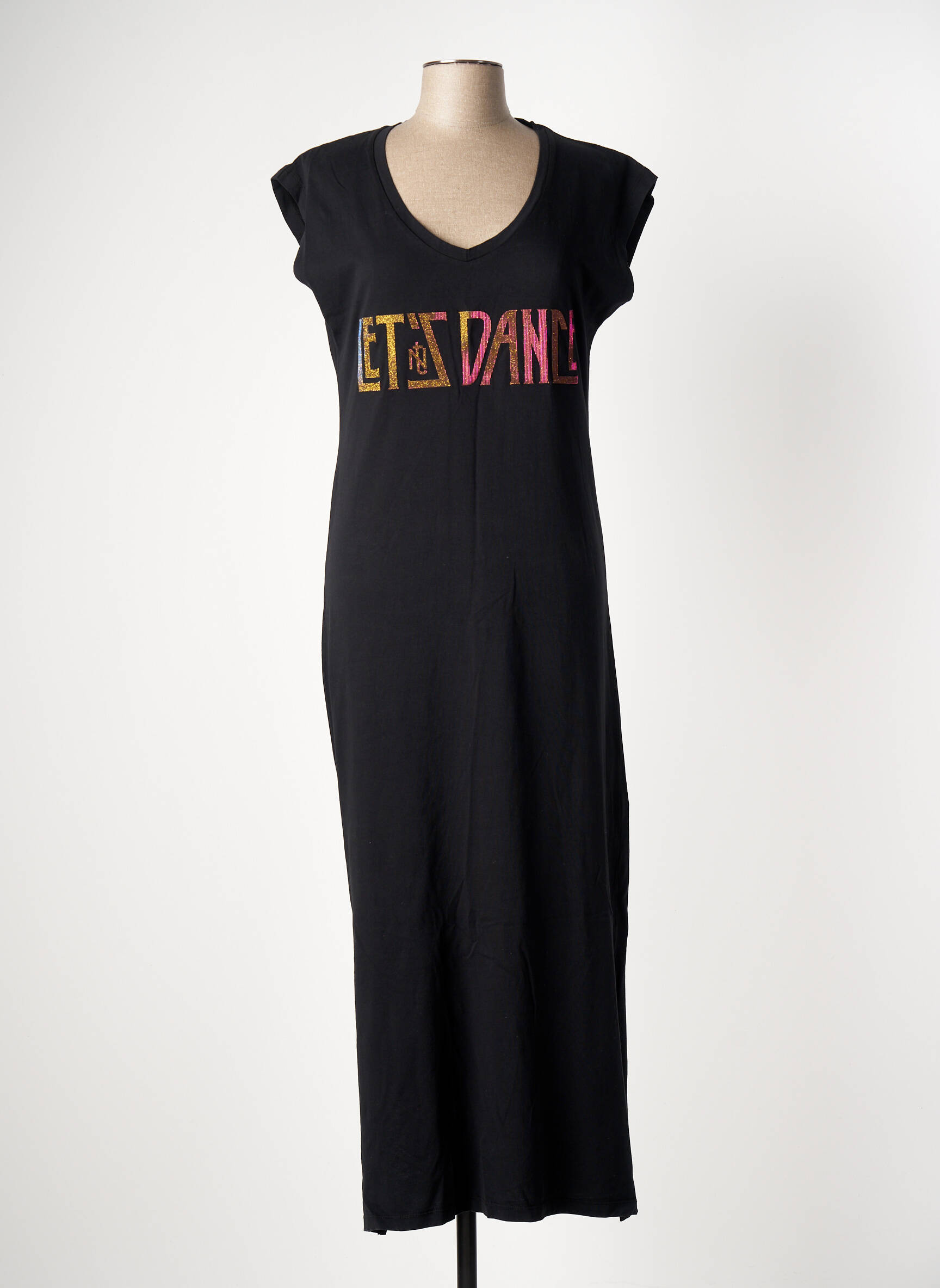 Et si votre robe devenait le billet d'entrée pour une soirée pleine d'énergie ? Cette robe longue noire de la marque NINE TEES pour femme allie confort et style avec sa coupe droite fluide et ses épaules légèrement structurées qui apportent une touche audacieuse. Son col en V souligne délicatement le décolleté tandis que l'inscription colorée "LET'S DANCE" sur la poitrine invite à la fête avec un esprit urbain et dynamique, parfaite pour afficher une allure à la fois décontractée et affirmée.