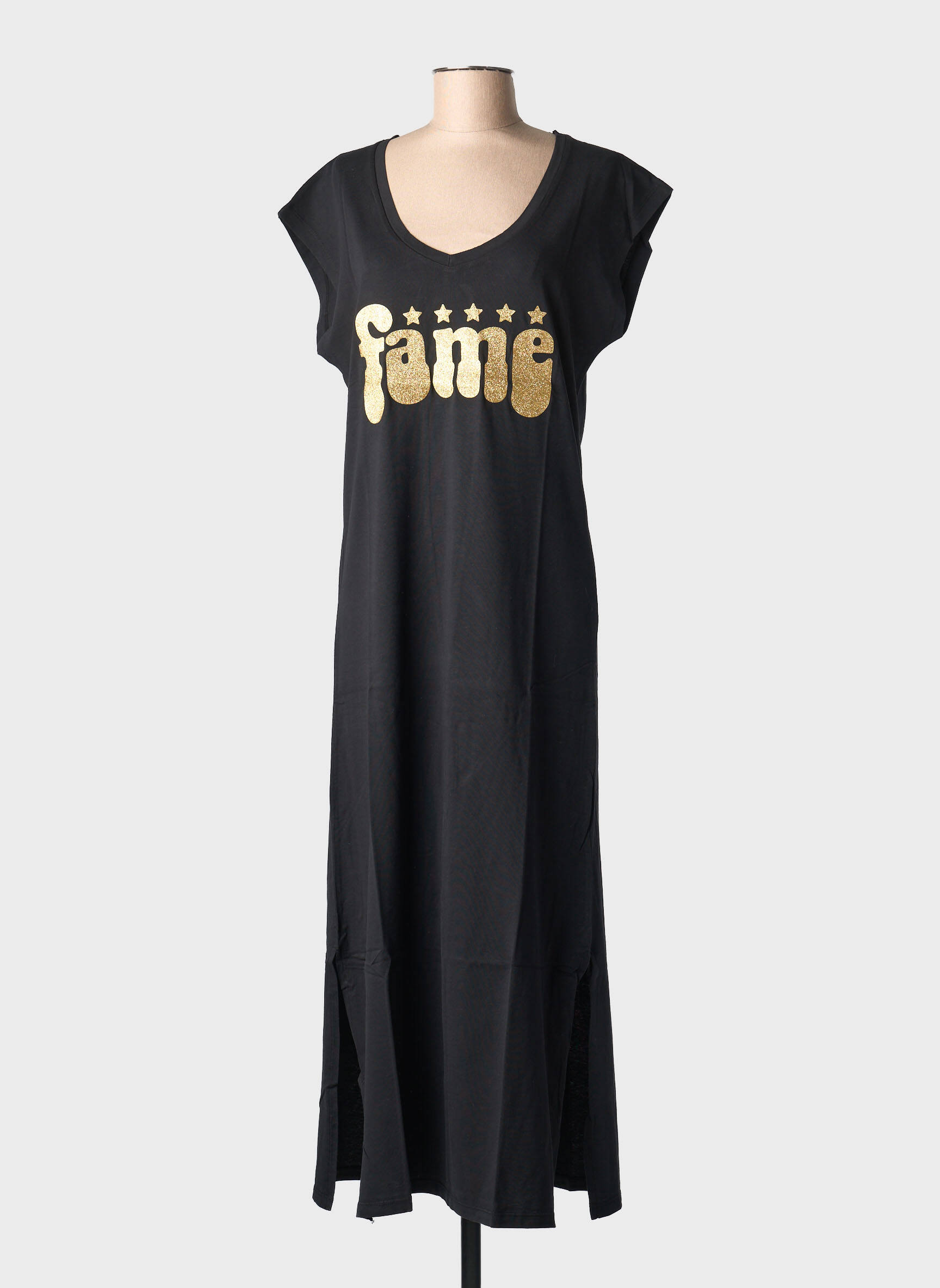 Craquez pour cette robe longue NINE TEES à prix mini, idéale pour adopter un look tendance sans se ruiner. Son inscription dorée “fame” sur le devant ajoute une touche lumineuse et originale à sa coupe fluide, tandis que sa matière légère et son coloris noir intemporel permettent de la porter aussi bien au quotidien qu'en soirée décontractée. C'est le bon plan à ne pas manquer pour celles qui veulent se faire plaisir sans compter.